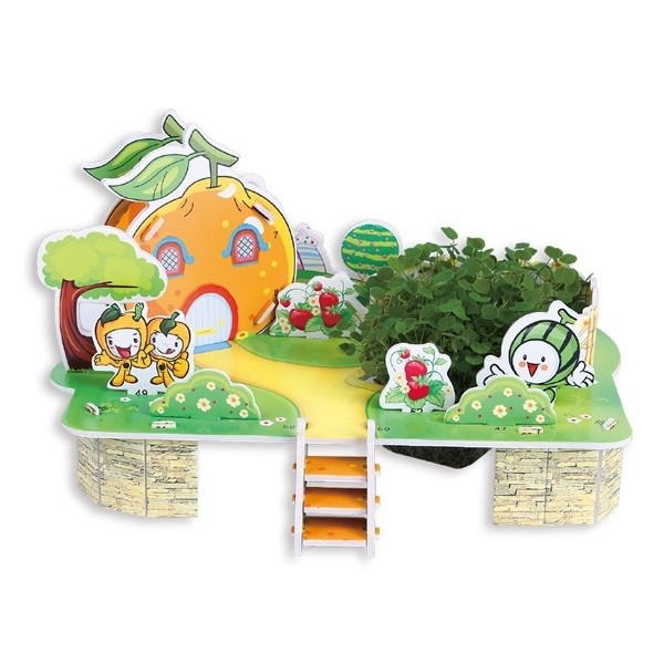 Используя набор для творчества, можно собрать необычный дом в форме тыквы в окружении уютного, зеленого сада. В саду растёт земляника, арбузы и цветут цветы.