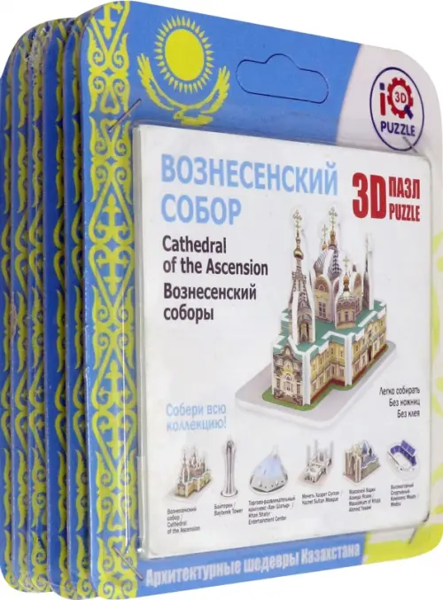 В комплект входят пазлы: Вознесенский собор, Байтерек, Торгово-развлекательный комплекс "Хан Шатыр", Мечеть Хазрет Султан, Мавзолей Ходжи Ахмеда Ясави,