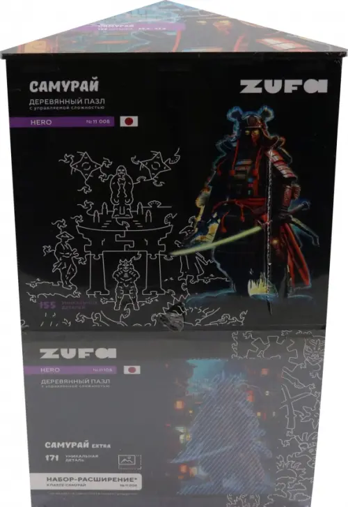 В наборе основной пазл (155 деталей), и дополнение (171 деталь). Дополнение увеличивает базовый сюжет пазла "Самурай" (№ 11008) на 171 деталь, позволяя расширить иллюстрацию в 1,5 раза.