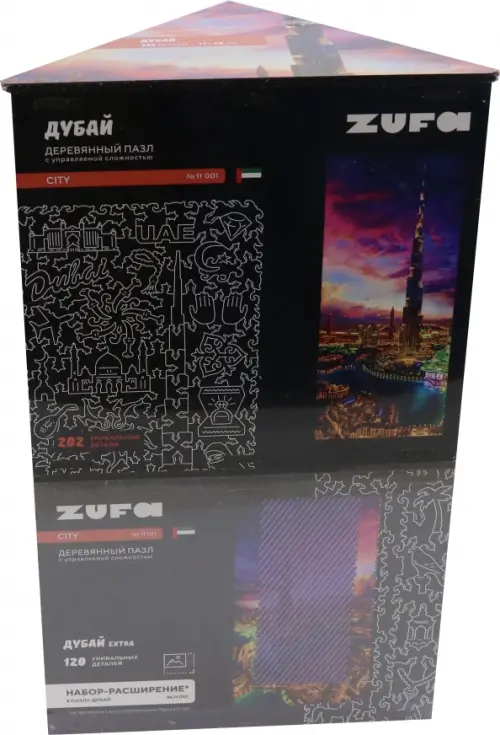 В наборе основной пазл (202 детали), и дополнение (120 деталей). Дополнение увеличивает базовый сюжет пазла "Дубай" (№ 11001) на 120 детали, позволяя расширить иллюстрацию в 1,5 раза.