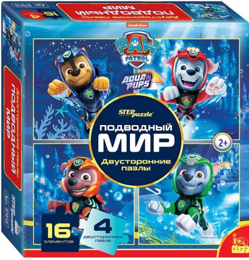 Двусторонние пазлы «Щенячий патруль. Подводный мир» содержат 4 двухсторонних пазла с одинаковым количеством элементов.