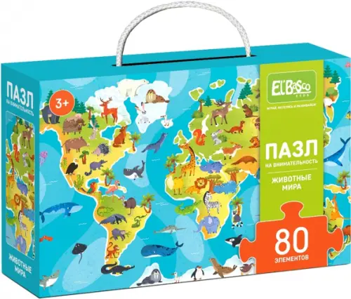 Яркий пазл станет занимательным детским увлечением. Изучаем материки, океаны, животный мир. Правильно сложив элементы, перед глазами предстанет карта мира. Вокруг иллюстрации имеется рамка, где изображены картинки из основной части пазла. Ребенку можно предложить найти одинаковые изображения с пазла и рамки. В процессе сборки ребенок сможет подбирать элементы, соединять их между собой. Пазл представляет собой большое полотно, состоящее из 80 деталей. Размер собранного пазла: 45*31 см.