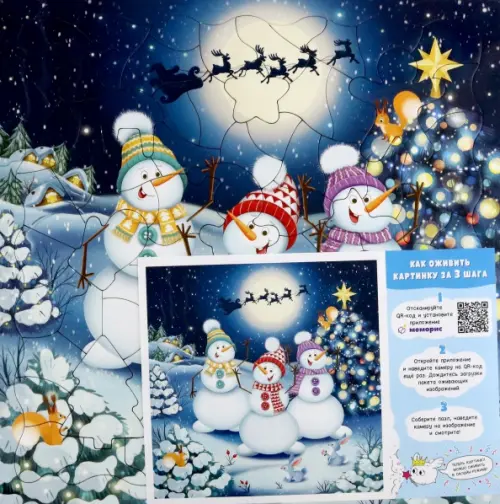 Снеговики готовы встречать Новый год! А ты? Правильно сложи все фрагменты - и увидишь их весёлый танец! Отсканируй QR-код, наведи камеру на изображение - и картинка со звуком оживёт! Элементы пазла - ёлка, ёлочные украшения и, конечно, сладости для главного зимнего праздника! Рассматривай детали, играй и собирай красочную картинку.