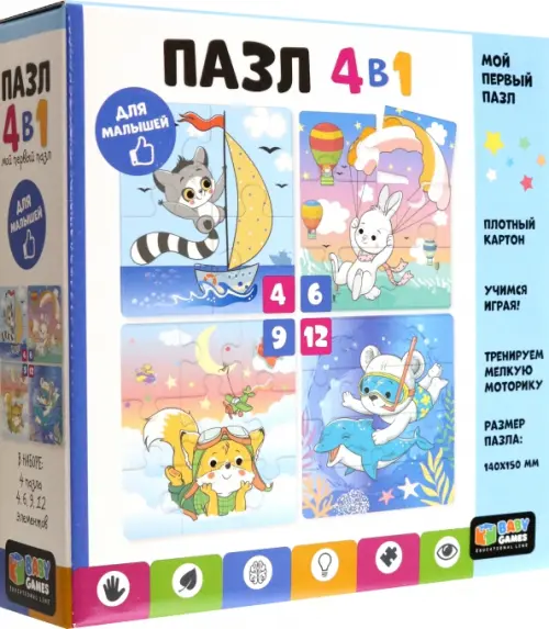 Набор пазлов 4в1 "Мечтатели" - это комплект пазлов с разной элементностью, включающий в себя головоломки из 4, 6, 9, 12 элементов, объединенных общей тематикой. Это необычная коллекция картинок с изображением милых персонажей, которая понравится любому ребенку. Соберите всю коллекцию! Постепенно усложняя сборку пазла от 4 элементов до 12 элементов, ребенок научится внимательности, концентрации, а также сможет развить мелкую моторику.