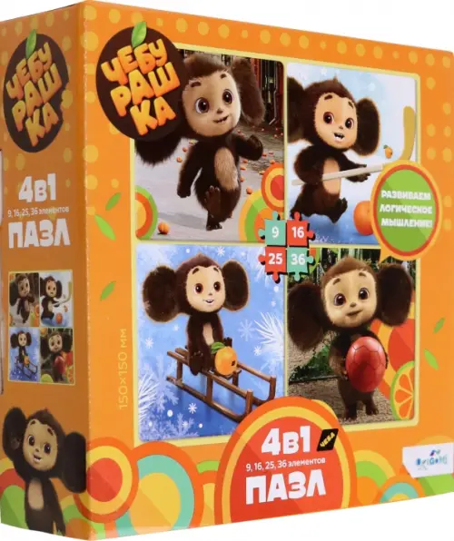 Набор пазлов 4в1 - это комплект пазлов с разной элементностью, включающий в себя головоломки из 9, 16, 25 и 36 элементов, объединенных общей тематикой. Набор пазлов с легендарным Чебурашкой понравится любому ребенку! Постепенно усложняя сборку пазла от 9 элементов до 36 элементов, ребенок научится внимательности, концентрации, а также сможет развить мелкую моторику.