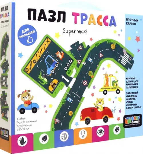 Напольный пазл из 19 элементов "Трасса" - это идеальный первый пазл для вашего малыша. Очень крупные детали удобно ложатся в маленькую ладошку, плотный картон позволит исключить заломы на деталях. Соберите пазл-трассу и устройте свои супер-гонки! Объедините несколько наборов, чтобы увеличить длину трассы. Играйте и развивайтесь вместе с пазлами Baby Games!