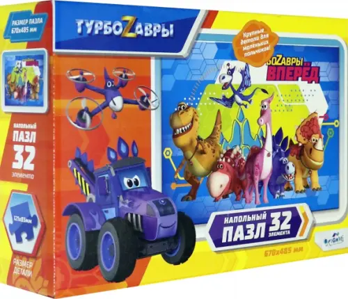 Герои мультфильма "Турбозавры" приглашают вместе попрактиковаться в умении собрать пазл, а заодно потренировать воображение, мелкую моторику, усидчивость и координацию движений. Очень крупные детали специально для самых маленьких! Готовый пазл можно использовать как напольный коврик. Функциональный размер позволит украсить интерьер.
