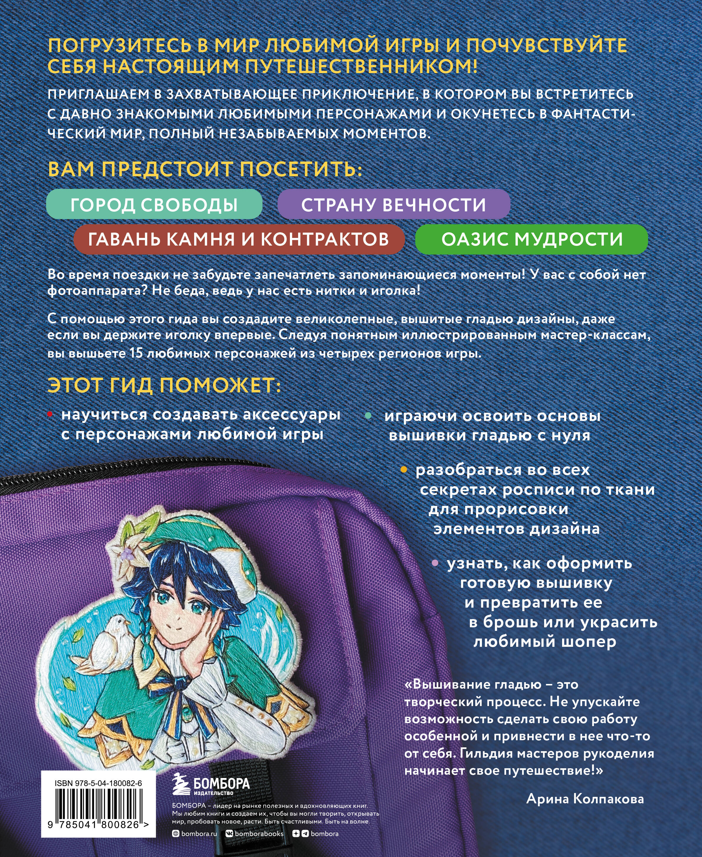 Погрузитесь в мир любимой игры, присоединившись к Гильдии мастеров рукоделия! Откройте для себя удивительные уголки Города свободы, Гавани камня и контрактов, Страны вечности и Оазиса мудрости, отправившись в незабываемое путешествие в компании любимых героев. Вам предстоит учинить небольшой погром вместе с Рыцарем Искоркой и пообедать с дружелюбным Хранителем очага. Наследник багрового Они предложит принять участие в жучином бою, а Странствующий фенек проведет экскурсию по густым джунглям. Чтобы запечатлеть все запоминающиеся моменты, фотоаппарат вам не понадобится - достаточно будет лишь нитки и иголки! С помощью этой книги вы создадите великолепные вышитые гладью дизайны, даже если вы держите иголку впервые. Следуя понятным иллюстрированным мастер-классам, вы вышьете 15 любимых персонажей из четырех регионов игры Геншин. Этот Гид поможет: • Играючи освоить основы вышивки гладью с нуля. • Научиться выбирать инструменты и материалы для работы. • Разобраться во всех секретах росписи по ткани для прорисовки элементов дизайна. • Узнать, как оформить готовую вышивку и превратить ее в стильный аксессуар. Никогда не забывайте, что вышивание гладью - это творческий процесс. Не упускайте возможность сделать свою работу особенной и привнести в неё что-то от себя.| Издательство | ООО "Издательство "Эксмо" |