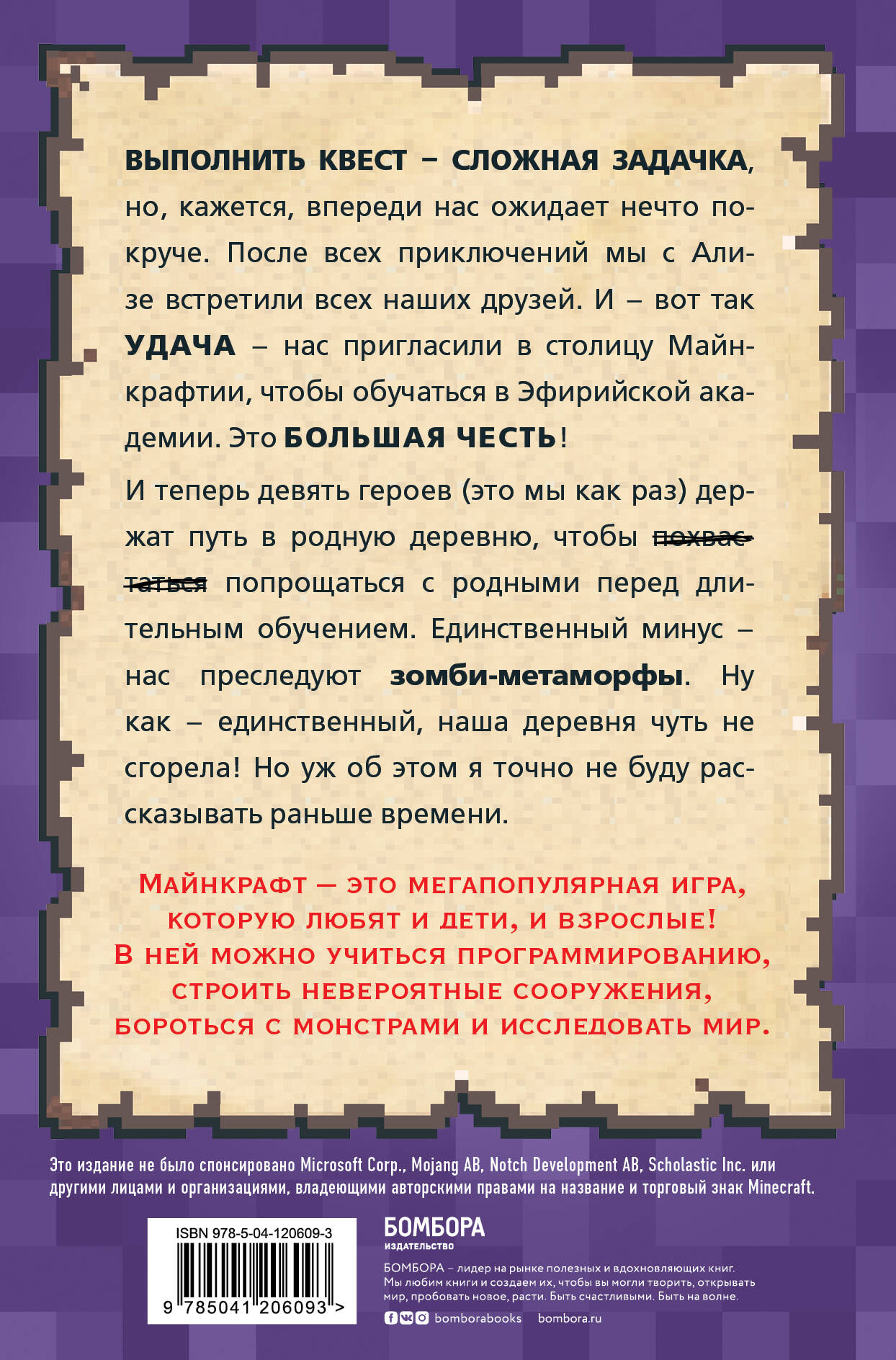 Выполнить квест - сложная задачка, но, кажется, нас ждут приключения покруче. После всех приключений мы с Ализе встретили всех наших друзей. И - вот так удача - нас пригласили в столицу Майнкрафтии, чтобы обучаться в Эфирийской академии. Это большая честь! И теперь девять героев (это мы как раз) держат путь в родную деревню, чтобы попрощаться с родными перед длительным обучением. Единственный минус - нас преследуют зомби-метаморфы. Ну как - единственный, наша деревня чуть не СГОРЕЛА! Но уж об этом я точно не буду рассказывать раньше времени.| Издательство | ООО "Издательство "Эксмо" |