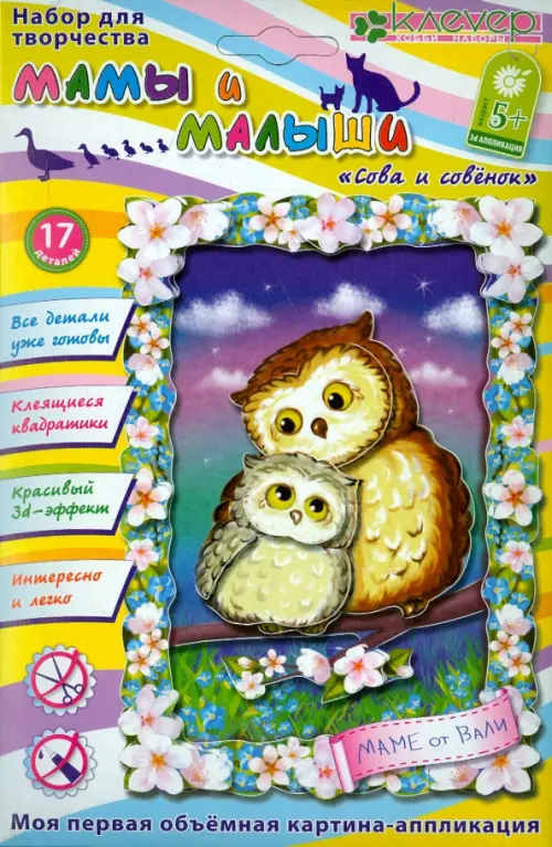 Набор научит ребёнка создавать объёмную картину в упрощённой технике аппликации. Создать 3-d картину легко: картонные детали, которые уже готовы и не требуют вырезания, нужно подобрать по изображению и наклеить послойно друг на друга в порядке указанной нумерации при помощи квадратиков объёмного клеящего материала (скотча).