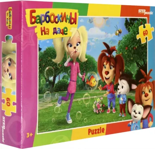 Пазл "Барбоскины" состоит из 60 элементов. Он посвящен выходу полнометражного мультфильма "Барбоскины на даче". На картинке мы видим Лизу, Розу и Малыша: они пускают мыльные пузыри и веселятся.