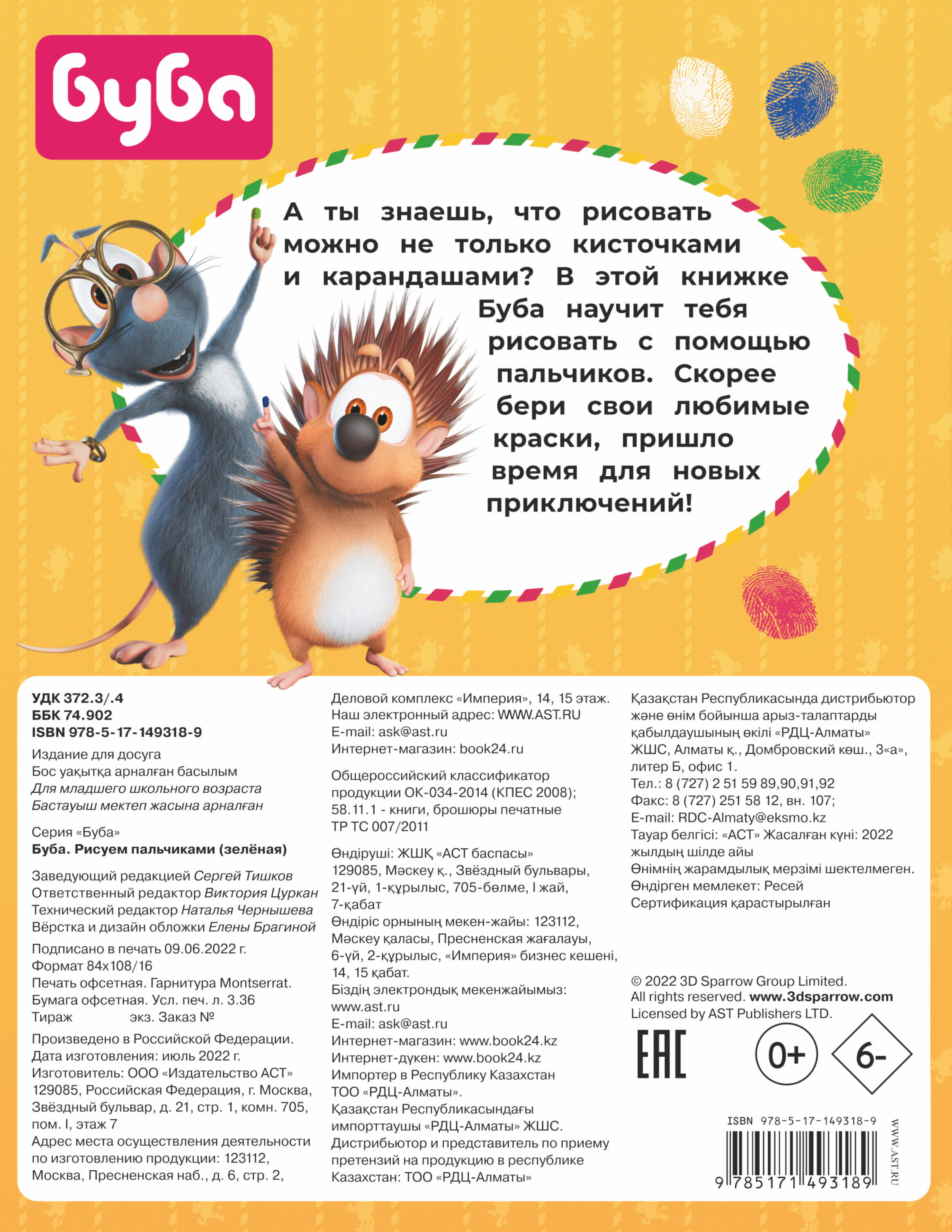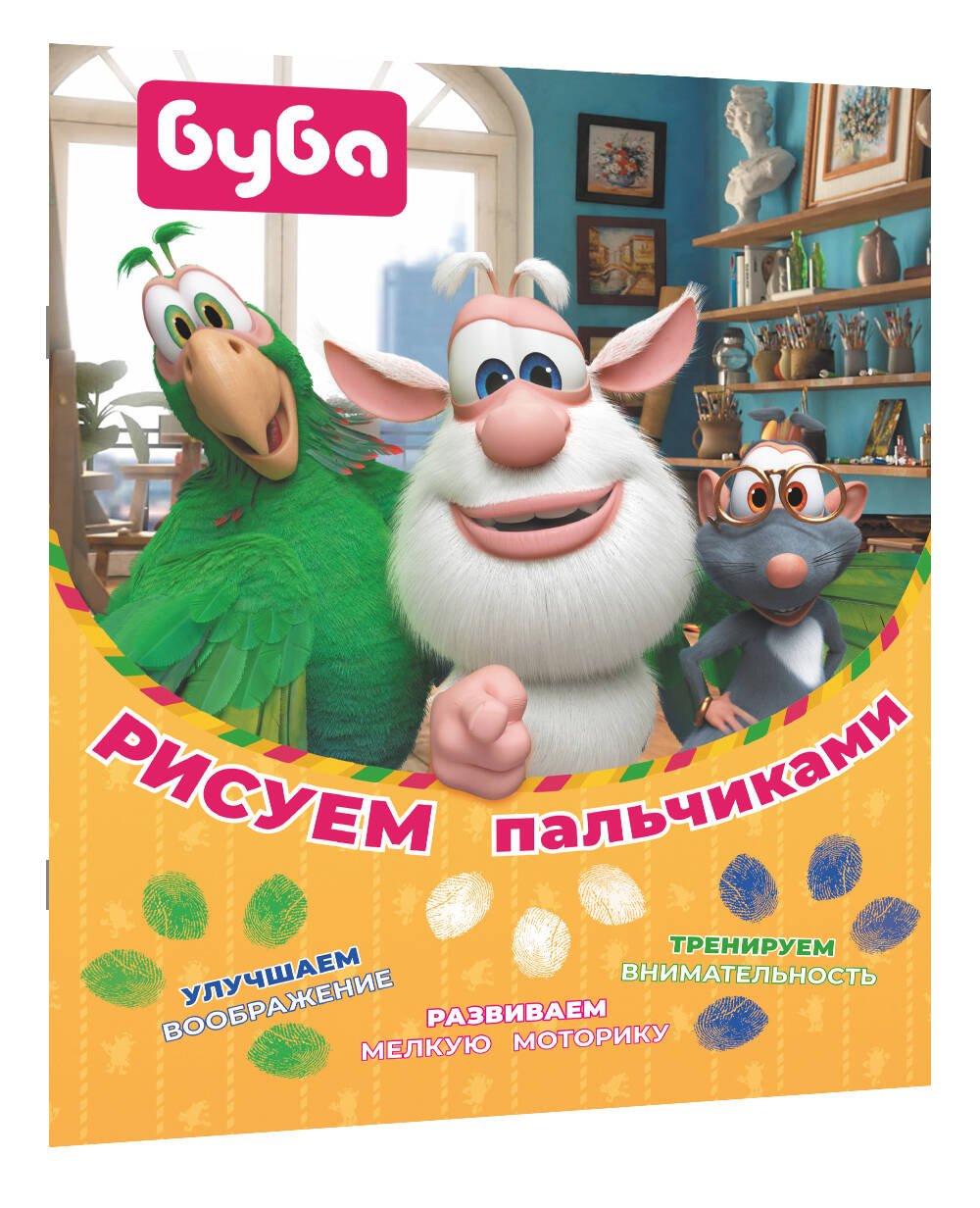 - Книга для творчества - понравится всем фанатам сериала «Буба». - Развиваем мелкую моторику и внимательность играючи. - Для этой книги не понадобятся ни карандаши, ни фломастеры, ни кисточки! - На одной странице картинка с готовым результатом - на соседней такая же, но с пустыми кружочками для отпечатков пальчиков. - С рисунками справится даже 3-летний ребёнок! Достаточно иметь баночки с красками и желание творить!| Издательство | АСТ |