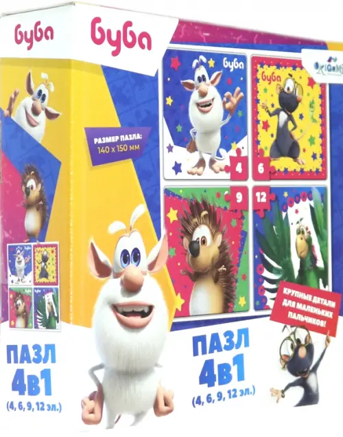 Набор пазлов 4 в 1 - это комплект пазлов с разной элементностью, включающий в себя головоломки из 4, 6, 9 и 12 элементов, объединенных общей тематикой. Это необычная коллекция картинок с изображением любимых персонажей мультфильма "Буба", которая понравится любому ребенку. Соберите всю коллекцию и окунитесь в новое приключение вместе с известными героями. Постепенно усложняя сборку пазла от 4 элементов до 12 элементов, ребенок научится внимательности, концентрации, а также сможет развить мелкую моторику.