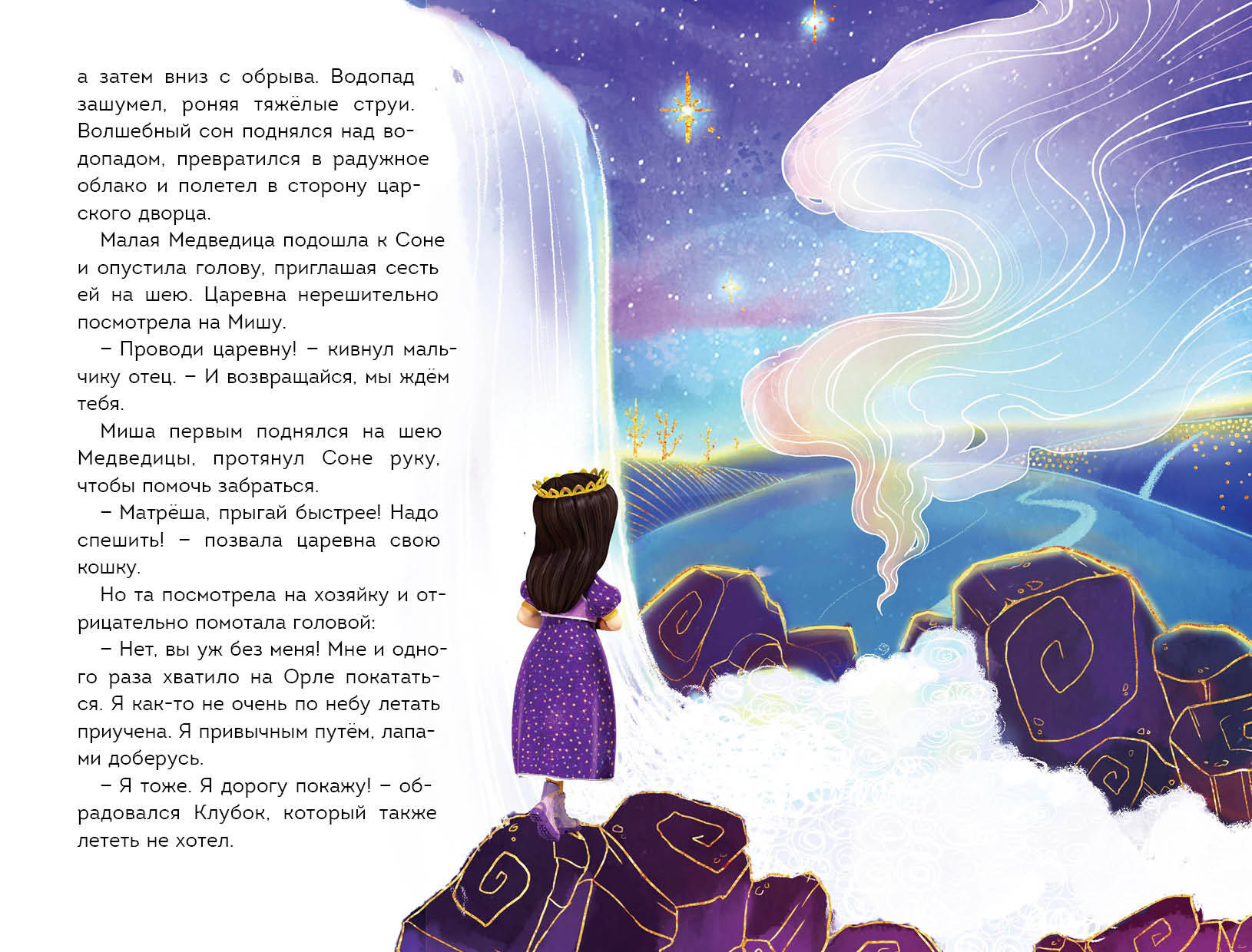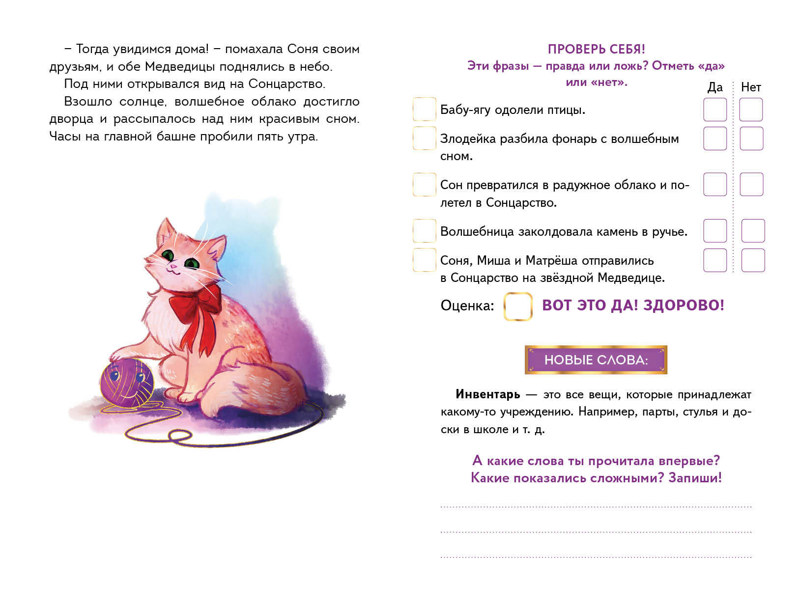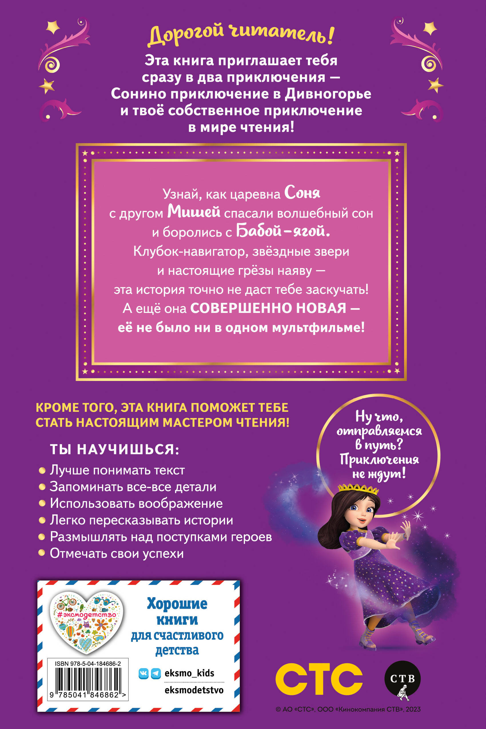История, которой не было в мультфильмах! В этой книге ребёнку предстоит вместе с царевной Соней спасти волшебный сон Сонцарства и победить Бабу Ягу, а заодно научиться самостоятельности и ответственности. Починить волшебный сон и спасти Сонцарство! Именно это предстоит сделать царевне Соне, ведь она случайно разбила шкатулку с волшебным сном и все в Сонцарстве уснули! Теперь ей нужно пересечь опасные запретные земли, населённые кошмарами, чтобы найти Радужный водопад и исправить свою ошибку. Но как это сделать девочке, которая даже не умеет завязывать шнурки? Хорошо, что мама дала Соне волшебное звёздное ожерелье. Похоже, Соню ждёт захватывающее и очень важное приключение! Книга помогает развивать навыки чтения у начинающих читателей. Для этого в ней есть масса полезных заданий на понимание текста, а также словарик новых слов и трекер чтения. Время с этой книгой станет для ребёнка лучшей частью дня, полезной и весёлой. Идеально для 7-10 лет!| Издательство | ООО "Издательство "Эксмо" |