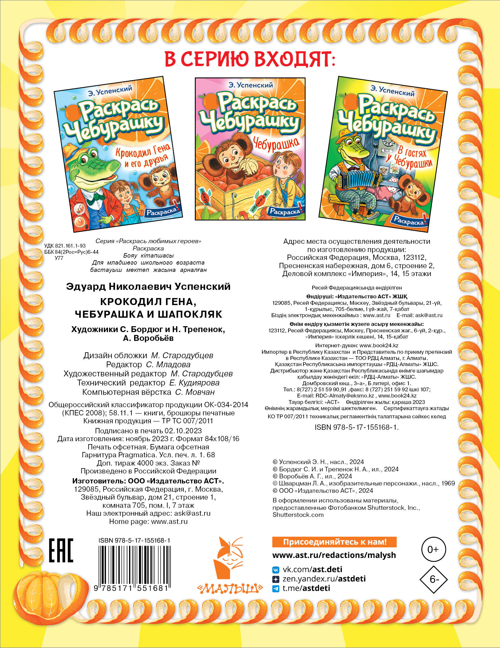 Крокодил Гена отслужил в армии и устроился на работу. Он охранял шоколад от грабителей. Но жулики во главе со старухой Шапокляк обманули Гену. Раскрась эту захватывающую детективную историю и узнаешь, как Чебурашка и Гена вернули себе честное имя. Раскрашивать Чебурашку и его друзей можно карандашами и фломастерами. Для младшего школьного возраста.| Издательство | ИЗДАТЕЛЬСТВО "АСТ" |