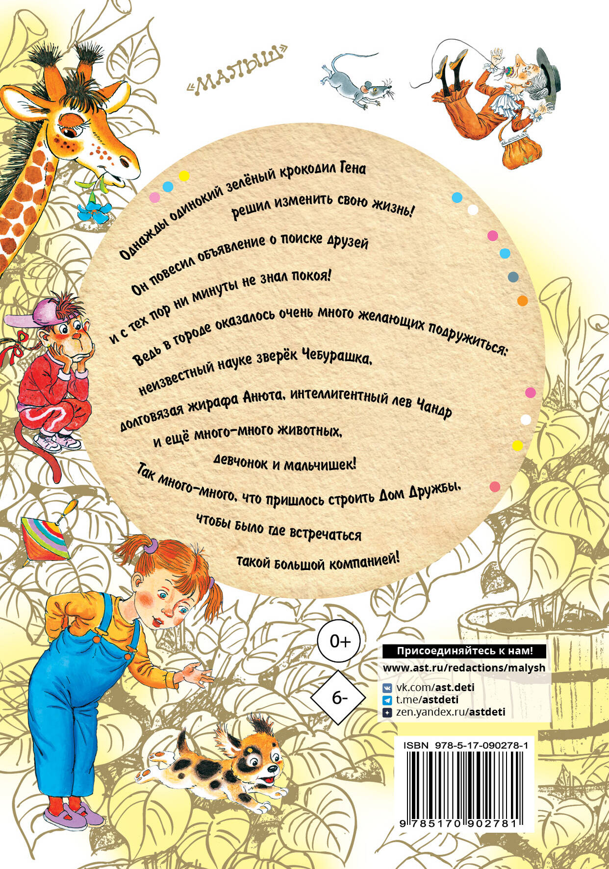 Однажды одинокий зеленый крокодил Гена решил изменить свою жизнь! Он повесил объявление о поиске друзей и с тех пор ни минуты не знал покоя! Ведь в городе оказалось очень много желающих подружиться: неизвестный науке зверек Чебурашка, долговязая жирафа Анюта, интеллигентный лев Чандр и еще много-много животных, девчонок и мальчишек! Так много, что пришлось строить Дом Дружбы, чтобы было, где встречаться такой большой компанией!| Издательство | ИЗДАТЕЛЬСТВО "АСТ" |