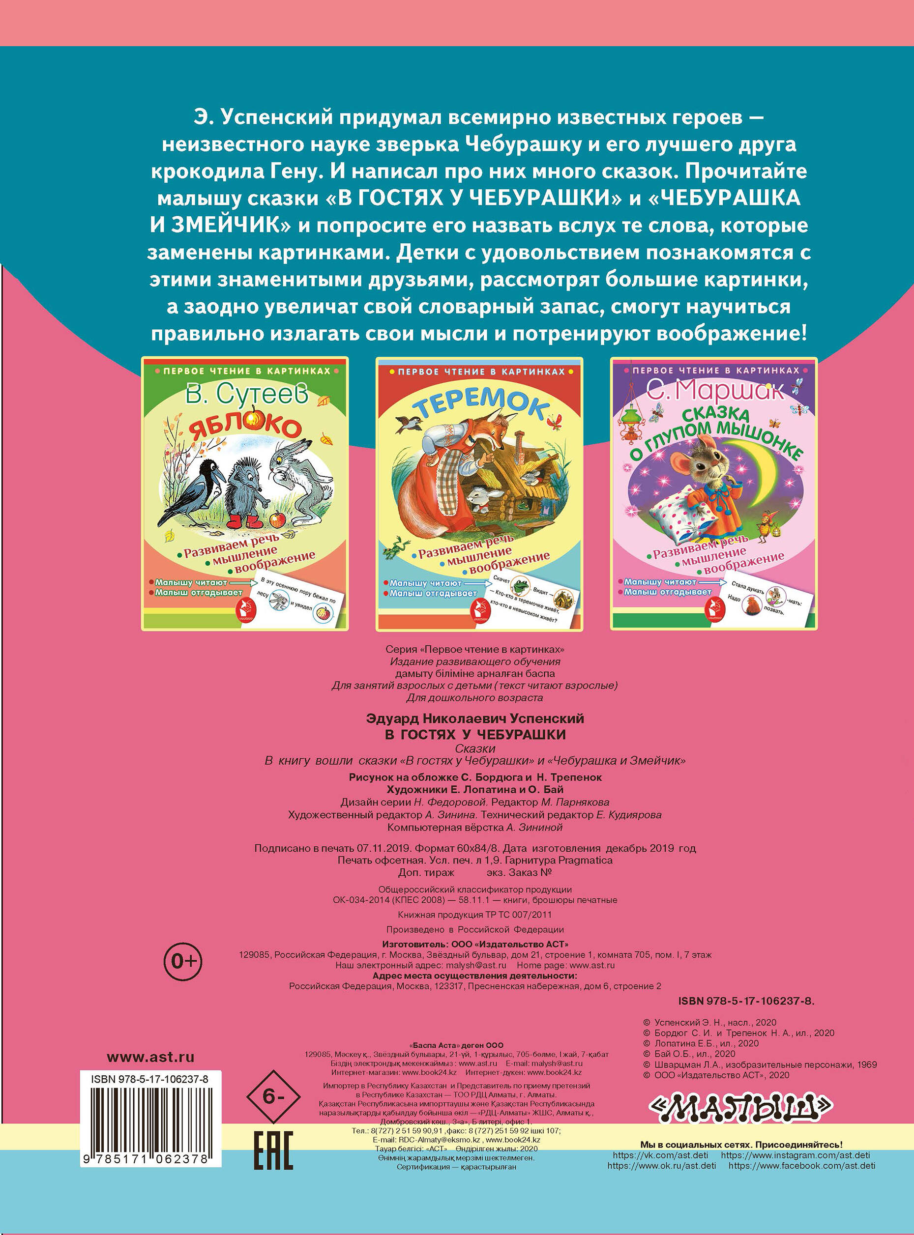 «Первое чтение в картинках» - это новая серия «Малыша», которая поможет родителям приучить маленьких мальчиков и девочек к чтению. Родители читают малышу произведения классиков детской литературы, где некоторые слова заменены картинками, а малыш называет сам это слово вслух. Эта увлекательная игра увеличивает словарный запас, развивает речь, мышление и воображение.| Издательство | ИЗДАТЕЛЬСТВО "АСТ" |