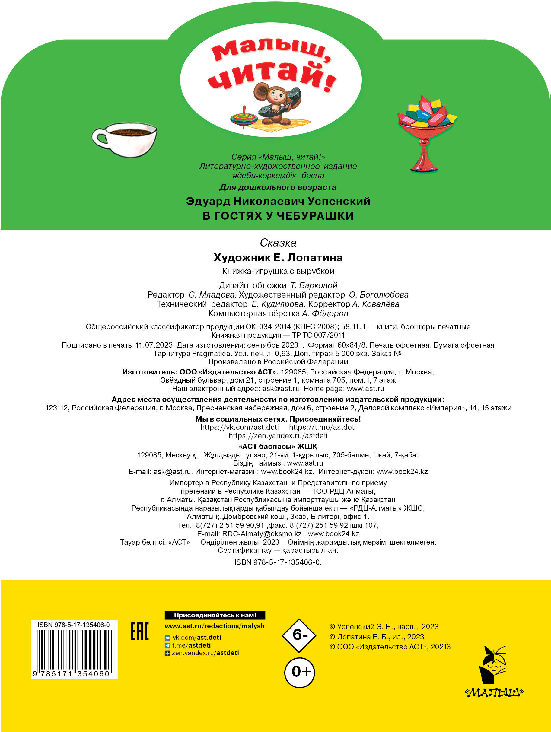 В этой маленькой книжечке рассказано о том, как Чебурашка пригласил крокодила Гену в гости в свою телефонную будку. Ребята узнают, что такое настоящая дружба и хорошее воспитание. А заодно познакомятся с самыми знаменитыми героями Эдуарда Успенского. Для дошкольного возраста.| Издательство | ИЗДАТЕЛЬСТВО "АСТ" |
