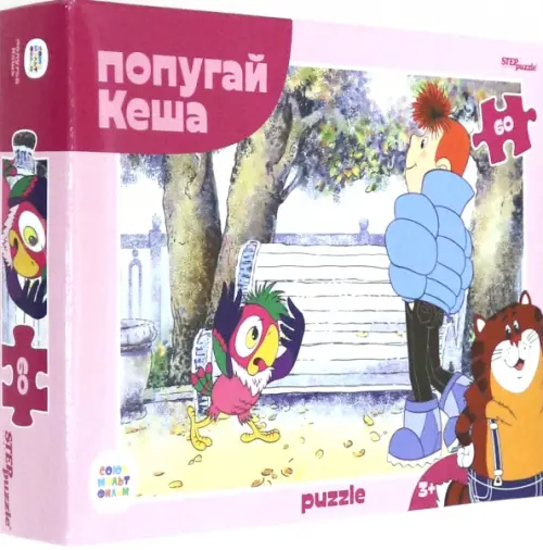 Пазл "Попугай Кеша" состоит из 60 элементов. Его картинка повторяет сцену из мультфильма: ту, где Кеша знакомится с новым хозяином и просит забрать его к себе.
