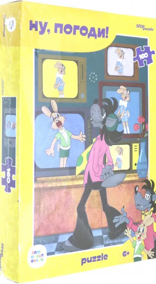 Пазл "Ну, погоди!" состоит из 160 элементов. На картинке мы видим известную сцену, как Волк зашел в магазин телевизоров.