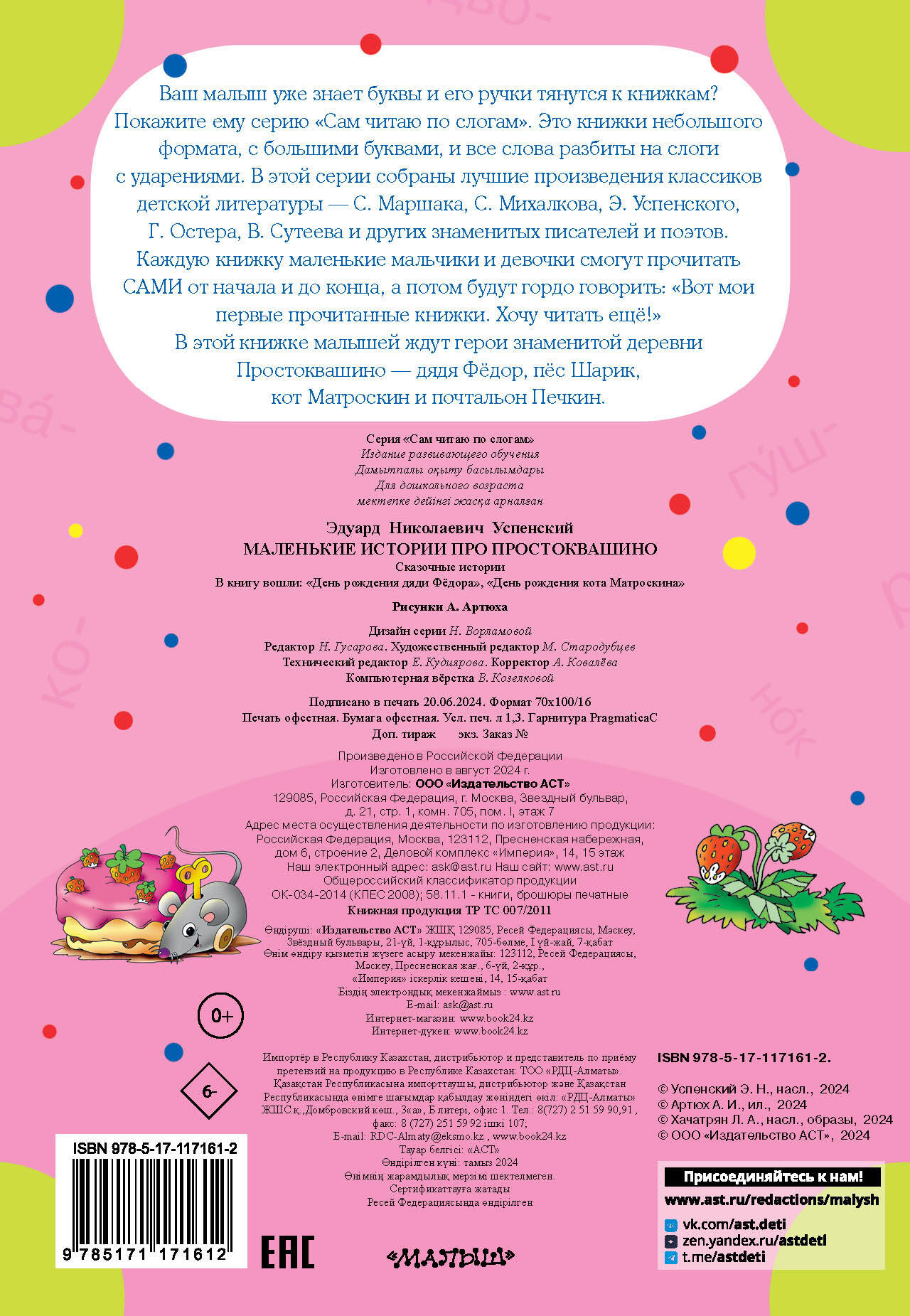 Ваш малыш уже знает буквы, и его ручки тянутся к книжкам? Дайте ему книжку из серии "Сам читаю по слогам". Эти книжки небольшого формата, с большими буквами, и все слова разбиты на слоги с ударениями. В этой серии собраны лучшие произведения классиков детской литературы - С. Маршака, С. Михалкова, Э. Успенского, Г. Остера, В. Сутеева и других знаменитых писателей и поэтов. Каждую книжку маленькие мальчики и девочки смогут прочитать САМИ от начала и до конца, а потом будут гордо говорить: "Вот мои первые прочитанные книжки. Хочу читать ещё!" В этой книжке малышей ждут герои знаменитой деревни Простоквашино - дядя Фёдор, пёс Шарик, кот Матроскин и почтальон Печкин.| Издательство | ИЗДАТЕЛЬСТВО "АСТ" |