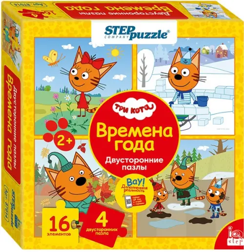 Двусторонние пазлы «Три кота. Времена года» содержат 4 двухсторонних пазла с одинаковым количеством элементов.
