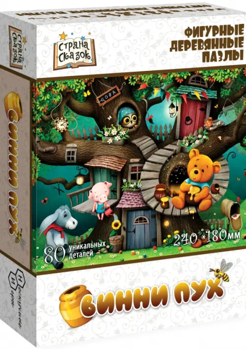 Фигурный пазл отличается от стандартного необычной формой деталей. Кроме того, часть деталей выполнены в форме предметов, связанных с тематикой картинки. В данном случае это, персонажи и предметы связанные со сказкой Винни Пух.