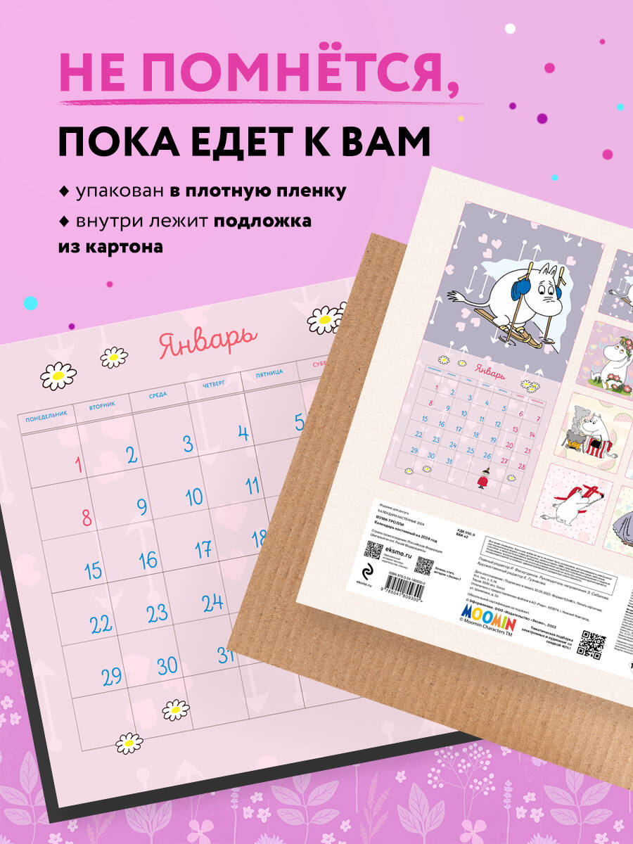 О серии: Наши настенные календари отличаются высоким качеством исполнения! Тщательно подобранные иллюстрации, напечатанные на глянцевой бумаге высочайшего качества, станут настоящим украшением дома, а в календарной сетке найдется место для ваших планов: большие клетки позволят делать записи и организовать свой год! В календаре также отмечены государственные праздники. В серии настенных календарей издательства «ЭКСМО» каждый найдет тему по вкусу: великие художники, великолепные подборки с самыми знаменитыми произведениями искусства, герои любимых мультфильмов. О календаре: Муми-тролли, фантастические персонажи финской писательницы Туве Янссон, теперь в календаре! Их сказочная мечта - реализация лучших возможностей, заложенных в человеке. Чудо обыкновенной жизни, которое они воспевают, может состояться лишь при одном условии: каждый имеет право быть самим собой, но никто не имеет права думать только о себе. Наполните свой дом удивительной атмосферой позитива и добра, как в доме Муми-троллей, в котором с распростертыми объятиями примут любого, кто бы ни пришел, усадят за стол, уложат спать, оставят жить насовсем. Муми-папа и Муми-мама лишь ставили новые кровати и расширяли обеденный стол. Календарь напечатан на плотной бумаге, с удобной сеткой, позволит делать заметки, планировать время и отмечать важные даты. Для кого: Высокое качество полиграфического исполнения прекрасно дополняет иллюстрации известной художницы, что непременно будет по достоинству оценено людьми с хорошим вкусом. Технические параметры: - Тип календаря - настенный перекидной. - Год - 2024. - Календарная сетка - с разбивкой по месяцам. - Вид скрепления - скрепка. - Ширина - 30 см. - Высота - 30 см. - Внутренний блок - мелованная бумага 150 г/м2. - Подложка - плотный гофрокартон для поддержания формы. - Индивидуальная упаковка в плотный целлофановый пакет."| Издательство | ООО "Издательство "Эксмо" |