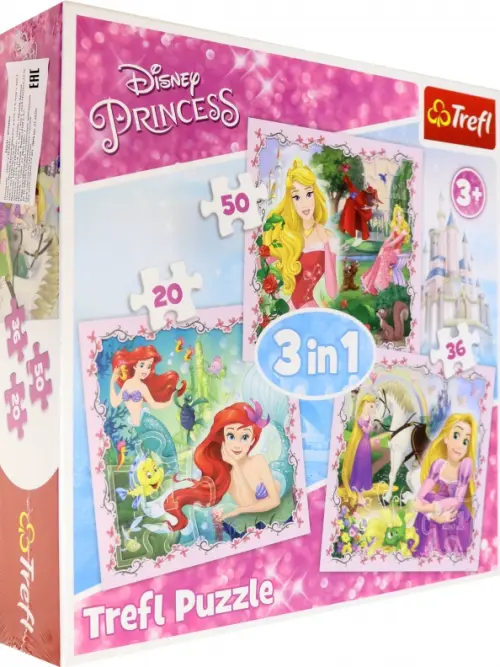 Набор пазлов - Рапунцель, Аврора и Ариэль от польской компании "Trefl" состоящий из 3 отдельных головоломок по 20, 36 и 50 элементов.
