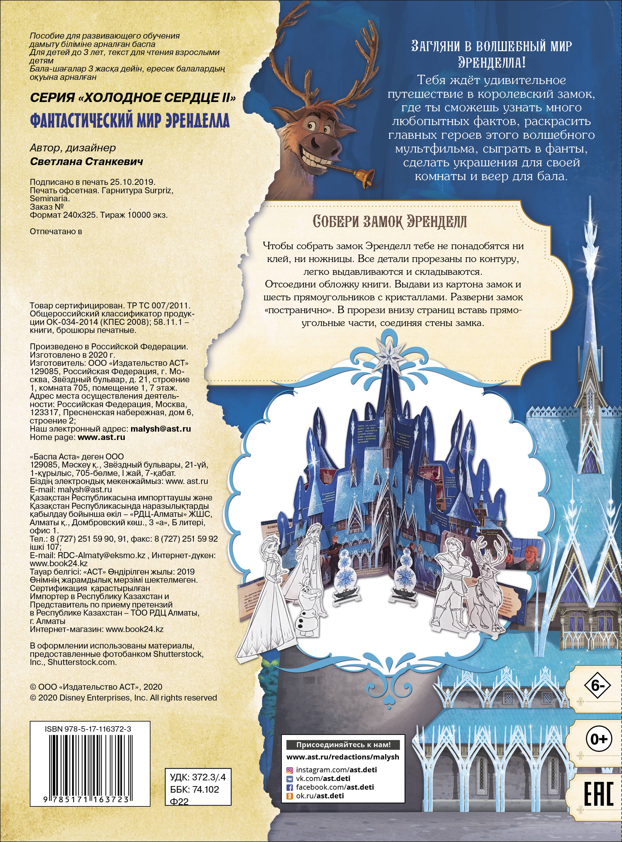 Чтобы собрать и украсить волшебный замок Эренделл, вам не понадобятся ни клей, ни ножницы. Все детали прорезаны по контуру, легко вынимаются и складываются. 5 причин купить эту книгу: - уникальная конструкция - интересные факты - возможность окунуться в фантастическую атмосферу мульфильма - забавные фанты и декоративные украшения для дома - любимые герои "Холодного сердца" 2!