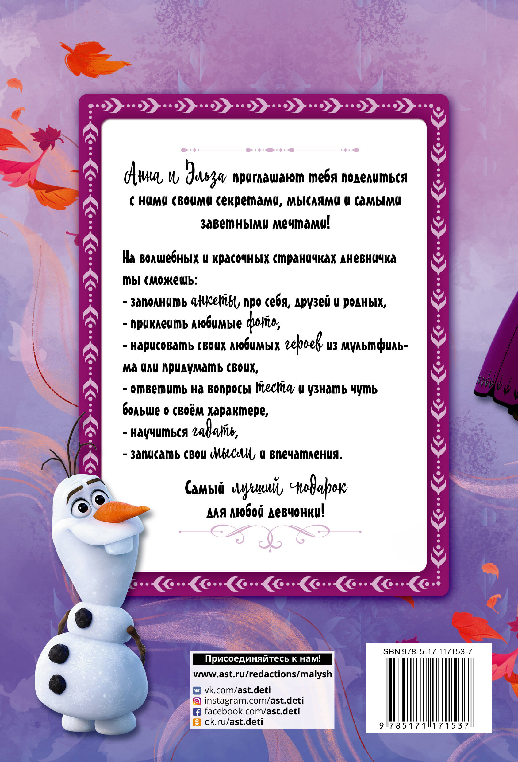 Любимые героини - Анна и Эльза - приглашают девочек поделиться с ними своими секретами, мыслями и самыми заветными мечтами. На волшебных и красочных страничках дневничка можно приклеить любимые фото, заполнить анкеты про себя, друзей и родных, нарисовать своих любимых героев из мультфильма или придумать своих, ответить на вопросы теста и узнать чуть больше о своем характере. Самый лучший подарок для любой девчонки! - плотная офсетная бумага, на которой удобно рисовать и писать - красочные странички со множеством любимых героев - множество интересных заданий, тестов, анкет, а также пустые разлинованные странички для секретиков и заветных мыслей Для девочек от 6 до 10 лет.| Издательство | ИЗДАТЕЛЬСТВО "АСТ" |