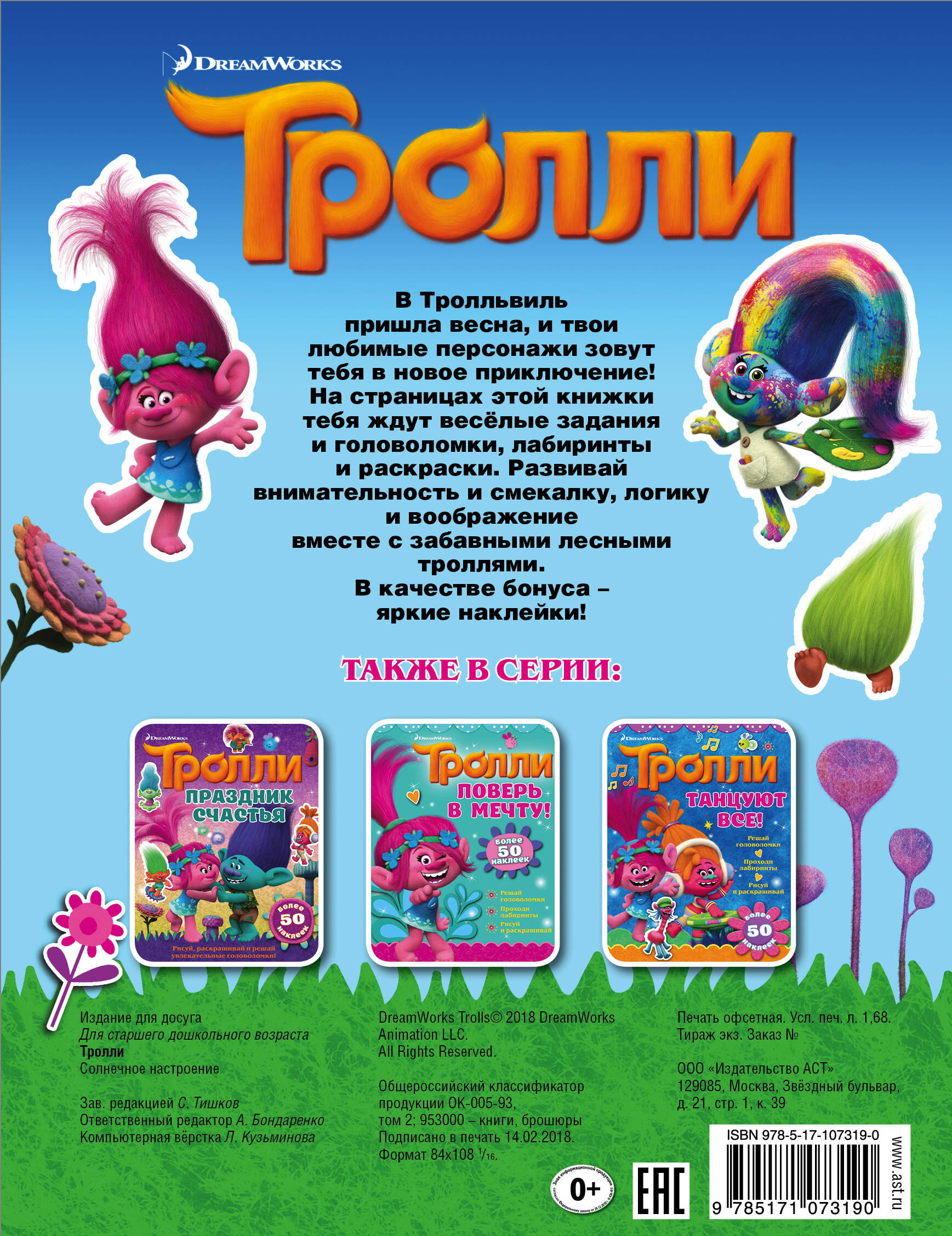 «Тролли. Солнечное настроение» - яркий альбом для творчества с развивающими играми и заданиями по мотивам популярного детского мультфильма. Тролли - жизнерадостный и непоседливый народ, их хорошее настроение мало что может испортить. А когда в Тролльвиль приходит весна, начинается время праздников и новых приключений. Присоединяйся к ним! Вместе с Розочкой и ее друзьями попробуй найти тень каждого из троллей, пройти лабиринт и нарисовать нескольких новых жителей Тролльвиля. В книге есть цветные наклейки!| Издательство | ИЗДАТЕЛЬСТВО "АСТ" |
