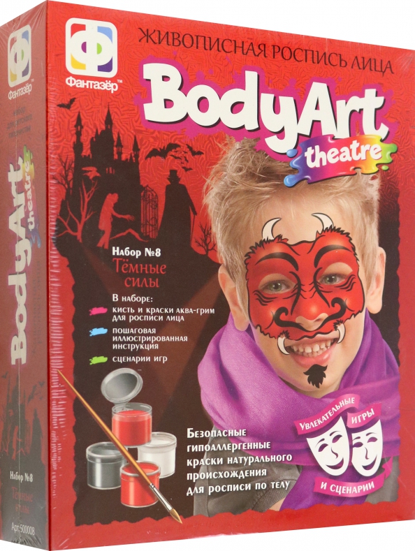 В наборе: кисть и краски для росписи лица; иллюстрированная подробная пошаговая инструкция; сценарии игр.
