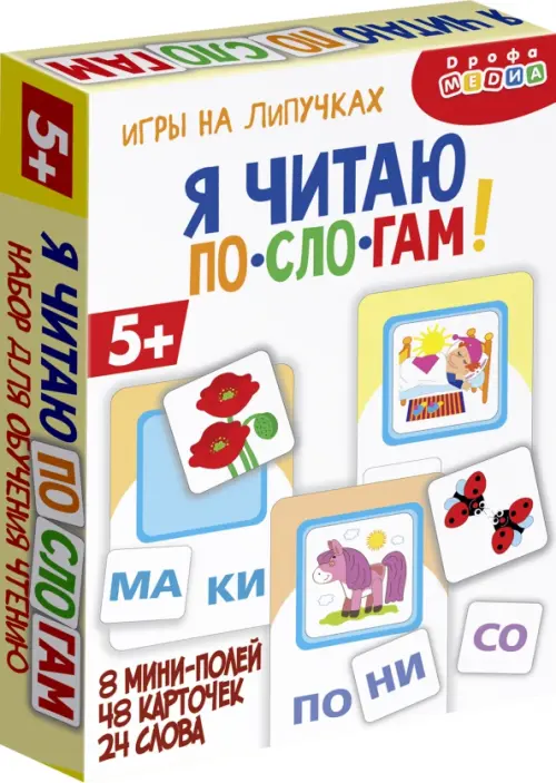 В комплекте: 8 мини-полей с уже приклеенными липучками, 24 карточки со слогами, 24 карточки с предметами, правила.