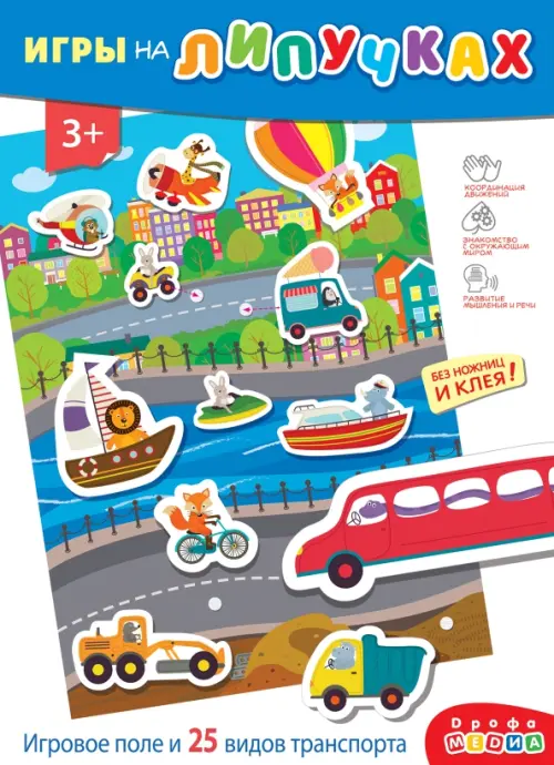 Игра знакомит с разными видами транспорта - наземным, водным и воздушным, учит пользоваться липучками, развивает речь, мышление, воображение, мелкую моторику.