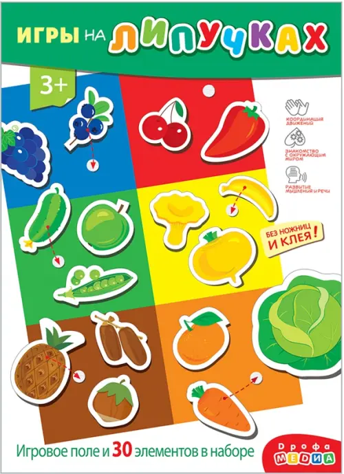 Игра знакомит с шестью основными цветами и различными плодами - овощами, фруктами, грибами, ягодами. Учит классифицировать предметы по разным основаниям, пользоваться липучками. Развивает речь, мышление, мелкую моторику.