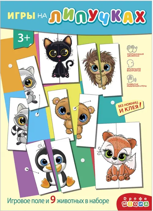 Игра знакомит с животными, учит собирать картинку из двух частей, пользоваться липучками. Развивает внимание, мышление, мелкую моторику.