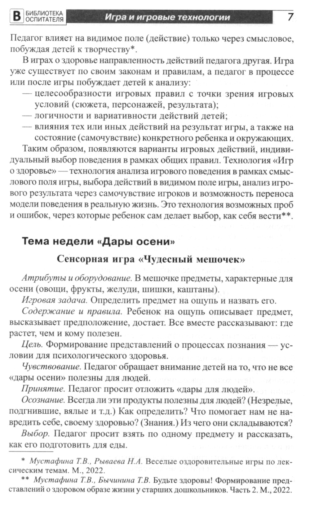 ФОП ДО (п. 22.8) предполагает воспитание осознанного отношения к жизни как основополагающей ценности и здоровью, как совокупности физического, духовного и социального благополучия человека. Проект «Будьте здоровы!» предлагает формы, способы, методы и средства решения данной задачи, где игра занимает центральное место, выполняя различные функции, закладывая основы личности ребенка (п. 24.5 и 24.6). Книга, которую вы держите в руках, является частью проекта и содержит практический материал для педагогов ДОО и родителей дошкольников в виде игровой технологии, где педагог создает проблемную игровую ситуацию для анализа (принятия или непринятия) дошкольниками условий здорового образа жизни, формирования осознанного отношения к здоровью своему и окружающих. Книга предназначена для методистов, инструкторов по физкультуре, воспитателей, родителей детей дошкольного возраста. «Игры о здоровье» могут быть использованы фрагментарно, являясь формой образовательного взаимодействия в ДОО, или комплексно в качестве вариативной части ООП ДОО по социально-коммуникативному и физическому воспитанию старших дошкольников.
