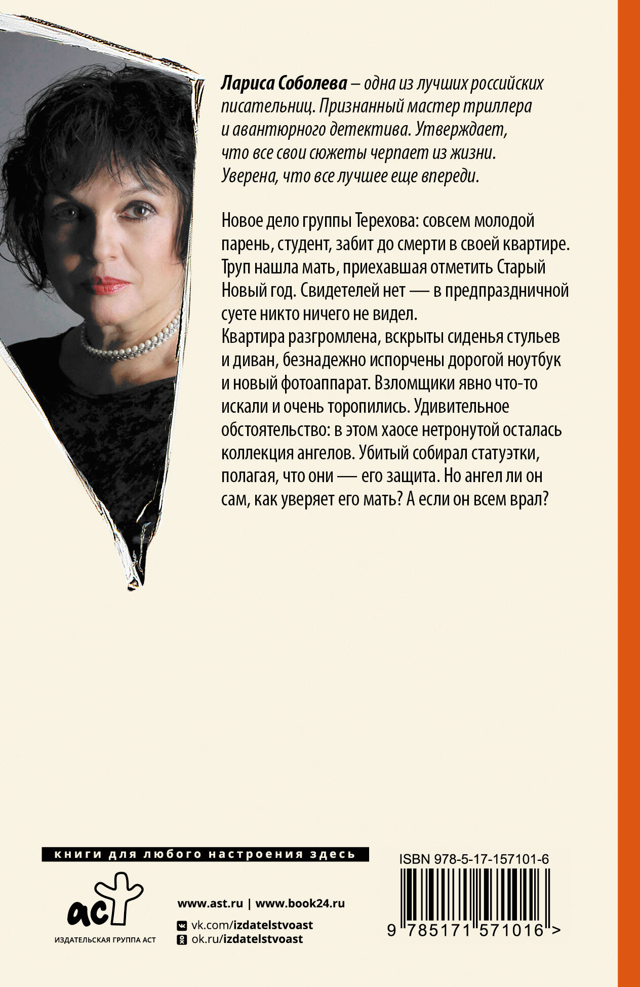 Новое дело группы Терехова: совсем молодой парень, студент забит до смерти в своей квартире. Труп нашла мать, приехавшая отметить Старый Новый год. Свидетелей нет - в предпраздничной суете никто ничего не видел. Квартира разгромлена, вскрыты сидения стульев и диван, разбиты дорогой ноутбук и новый фотоаппарат. Взломщики явно что-то искали и очень торопились. Удивительное обстоятельство: в разбитой квартире нетронутой осталась коллекция ангелов. Убитый собирал статуэтки, полагая, что они - его защита. Но ангел ли он сам, как уверяет его мать? А если он всем врал?| Издательство | ИЗДАТЕЛЬСТВО "АСТ" |