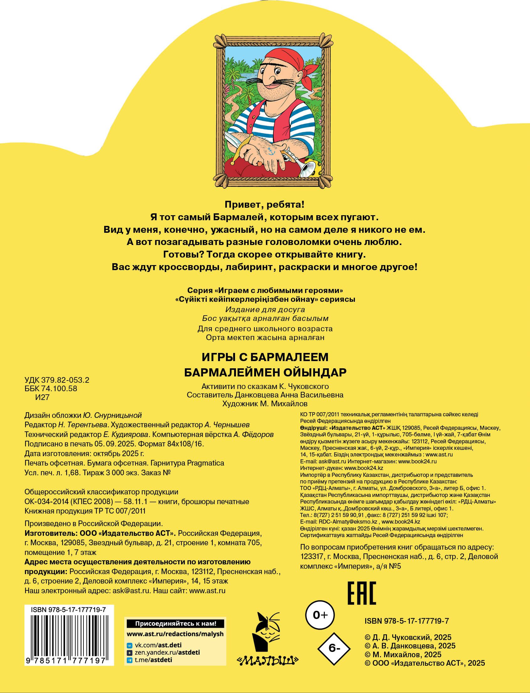 Привет, ребята! Я тот самый Бармалей, которым всех пугают. Вид у меня, конечно, ужасный, но на самом деле я никого не ем. А вот позагадывать разные головоломки очень люблю. Готовы? Тогда скорее открывайте книгу. Вас ждут кроссворды, лабиринт, раскраски и многое другое!| Издательство | Издательство "АСТ" |