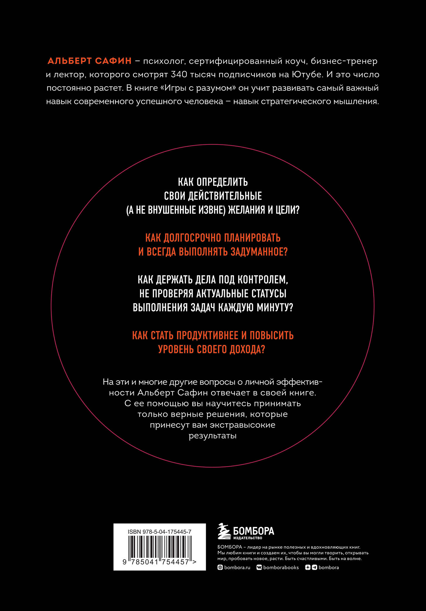 Альберт Сафин - психолог, сертифицированный коуч, бизнес-тренер и лектор, которого смотрят 340 тысяч подписчиков на Ютубе. И это число постоянно растет. В книге «Игры с разумом» он учит развивать самый важный навык современного успешного человека - навык стратегического мышления. КАК определить свои действительные (а не внушенные извне) желания и цели? КАК долгосрочно планировать и всегда выполнять задуманное? КАК держать дела под контролем, не проверяя актуальные статусы выполнения задач каждую минуту? КАК стать продуктивнее и повысить уровень своего дохода? На эти и многие другие вопросы о личной эффективности Альберт Сафин отвечает в своей книге. С ее помощью вы научитесь принимать только верные решения, которые принесут вам экстравысокие результаты.| Издательство | ООО "Издательство "Эксмо" |