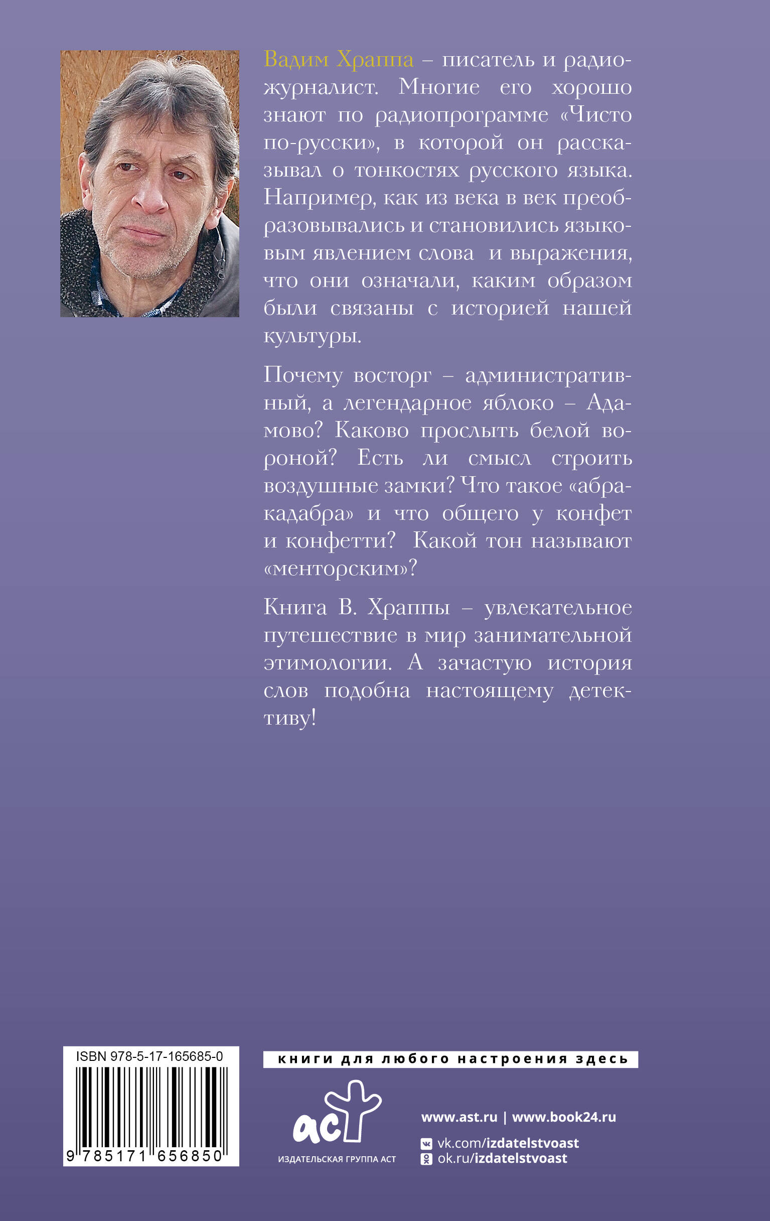 Вадим Храппа - писатель и радиожурналист. Многие его хорошо знают по радиопрограмме "Чисто по-русски", в которой он рассказывал о тонкостях русского языка. Например, как из века в век преобразовывались и становились языковым явлением слова и выражения, что они означали, каким образом были связаны с историей нашей культуры. Почему восторг - административный, а легендарное яблоко - Адамово? Каково прослыть белой вороной? Есть ли смысл строить воздушные замки? Что такое "абракадабра" и что общего у конфет и конфетти? Какой тон называют "менторским"? Книга В. Храппы - увлекательное путешествие в мир занимательной этимологии. А зачастую история слов подобна настоящему детективу!| Издательство | Издательство "АСТ" |