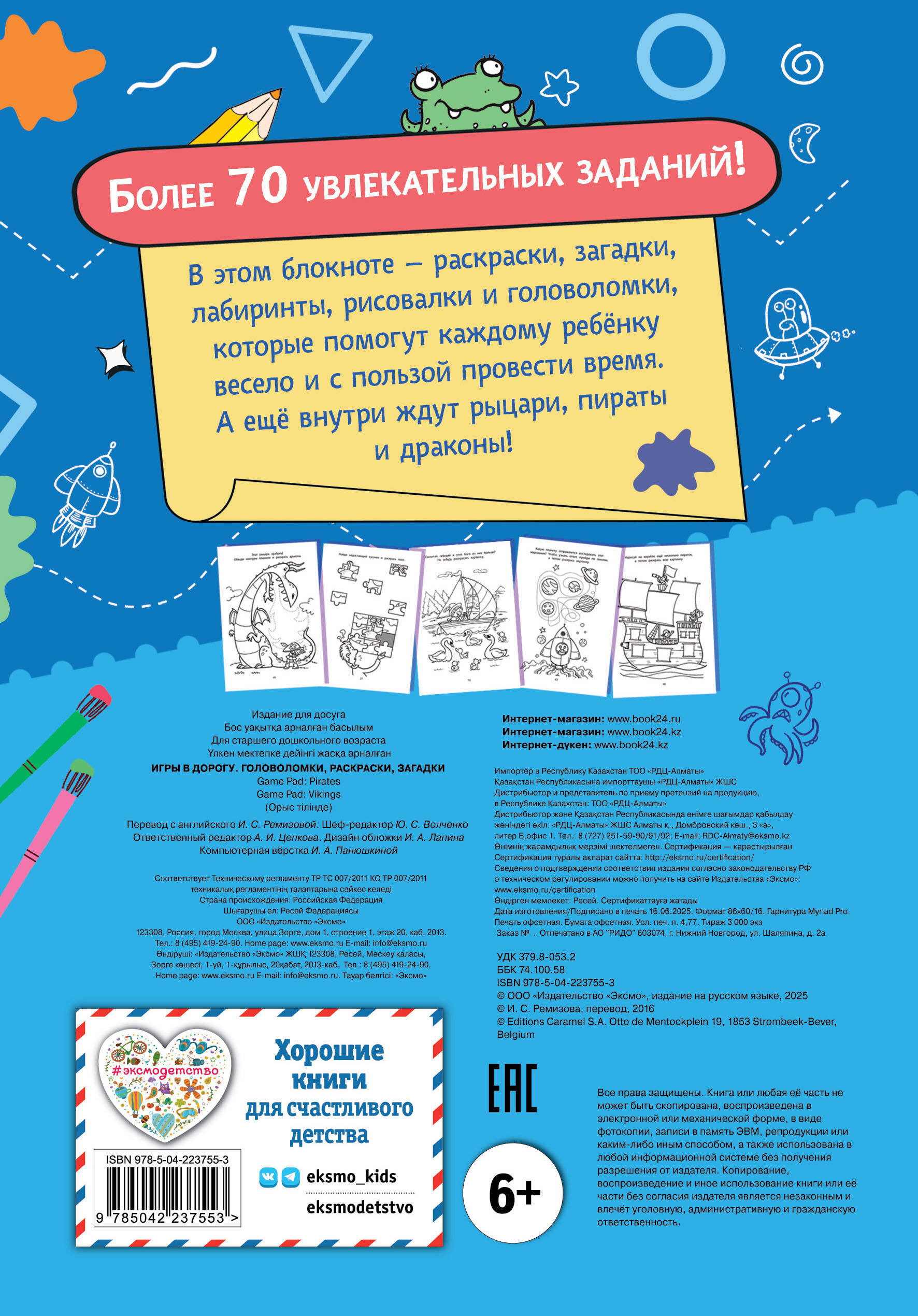 В этом блокноте - более 70 увлекательных заданий для детей 5-7 лет! Раскраски, загадки, лабиринты и головоломки с рыцарями, пиратами и драконами помогут каждому ребёнку весело и с пользой провести время. А компактный формат позволяет взять блокнот с собой в поездку, на дачу или на прогулку, чтобы ребёнок точно не заскучал.| Издательство | ООО "Издательство "Эксмо" |