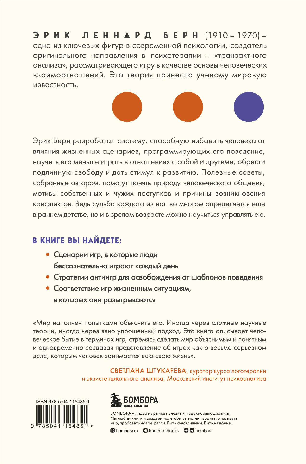 Перед вами легендарный бестселлер по психологии человеческих взаимоотношений, переизданный с новой научной редактурой. Эрик Берн разработал систему, способную избавить человека от влияния жизненных сценариев, программирующих его поведение, научить его меньше играть в отношениях с собой и другими, обрести подлинную свободу и побудить к личностному росту. В этой книге вы найдете много полезных советов, которые помогут понять природу человеческого общения, мотивы собственных и чужих поступков и причины возникновения конфликтов. По мнению автора, судьба каждого из нас во многом определяется еще в раннем детстве, однако в зрелом возрасте можно научиться управлять ею, если этого захотеть. Именно с публикации этого международного бестселлера после падения железного занавеса в нашей стране начался психологический бум, когда миллионы людей осознали, что с помощью психологии можно многое понять в себе и окружающих. Об авторе Эрик Леннард Берн (1910-1970) - одна из ключевых фигур в современной психологии, создатель оригинального направления в психотерапии - «транзактного анализа», рассматривающего игру в качестве основы человеческих взаимоотношений. Разработка этой теории принесла ученому мировую известность. Фишки книги Более 50 лет является абсолютным бестселлером по человеческим взаимоотношениям. Входит в мировой Топ-5 самых популярных книг по психологии. В России продано более 350 000 экземпляров. Для кого эта книга Для всех, кто хочет лучше разбираться в себе и окружающих. Для читателей, интересующихся классикой современной популярной психологии.| Издательство | ООО "Издательство "Эксмо" |