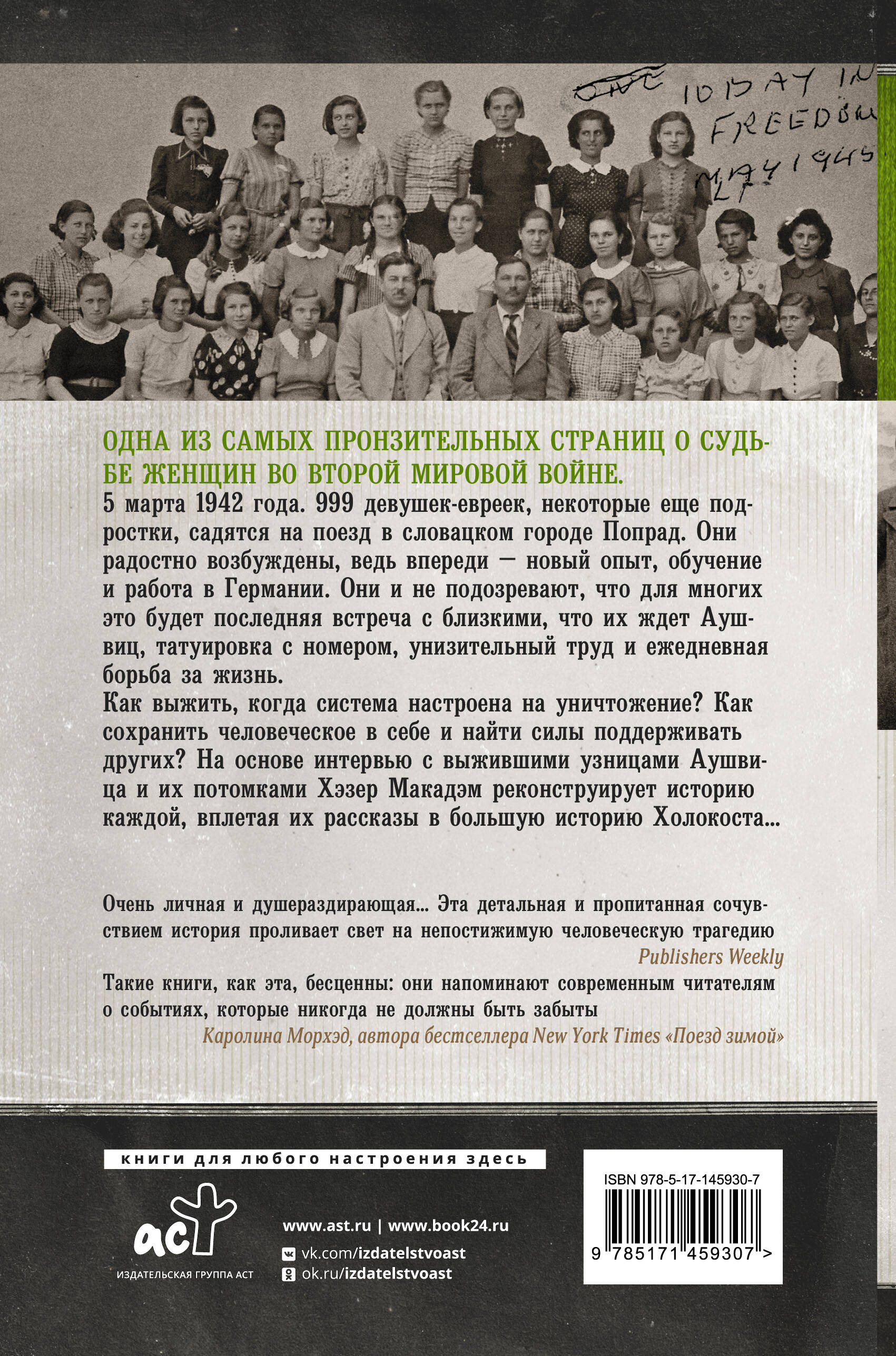 ОДНА ИЗ САМЫХ ПРОНЗИТЕЛЬНЫХ СТРАНИЦ О СУДЬБЕ ЖЕНЩИН ВО ВТОРОЙ МИРОВОЙ ВОЙНЕ. 5 марта 1942 года. 999 девушек евреек, некоторые еще подростки, садятся на поезд в словацком городе Попрад. Они радостно возбуждены, ведь впереди - новый опыт, обучение и работа в Германии. Они и не подозревают, что для многих это будет последняя встреча с близкими, что их ждет Аушвиц, татуировка с номером, унизительный труд и ежедневная борьба за жизнь. Как выжить, когда система настроена на уничтожение? Как сохранить человеческое в себе и найти силы поддерживать других? На основе интервью с выжившими узницами Аушвица и их потомками Хэзер Макадэм реконструирует историю каждой, вплетая их рассказы в большую историю Холокоста… «Очень личная и душераздирающая… Эта детальная и пропитанная сочувствием история проливает свет на непостижимую человеческую трагедию». Publishers Weekly «Такие книги, как эта, бесценны: они напоминают современным читателям о событиях, которые никогда не должны быть забыты». Каролина Морхэд, автора бестселлера New York Times «Поезд зимой»| Издательство | АСТ |