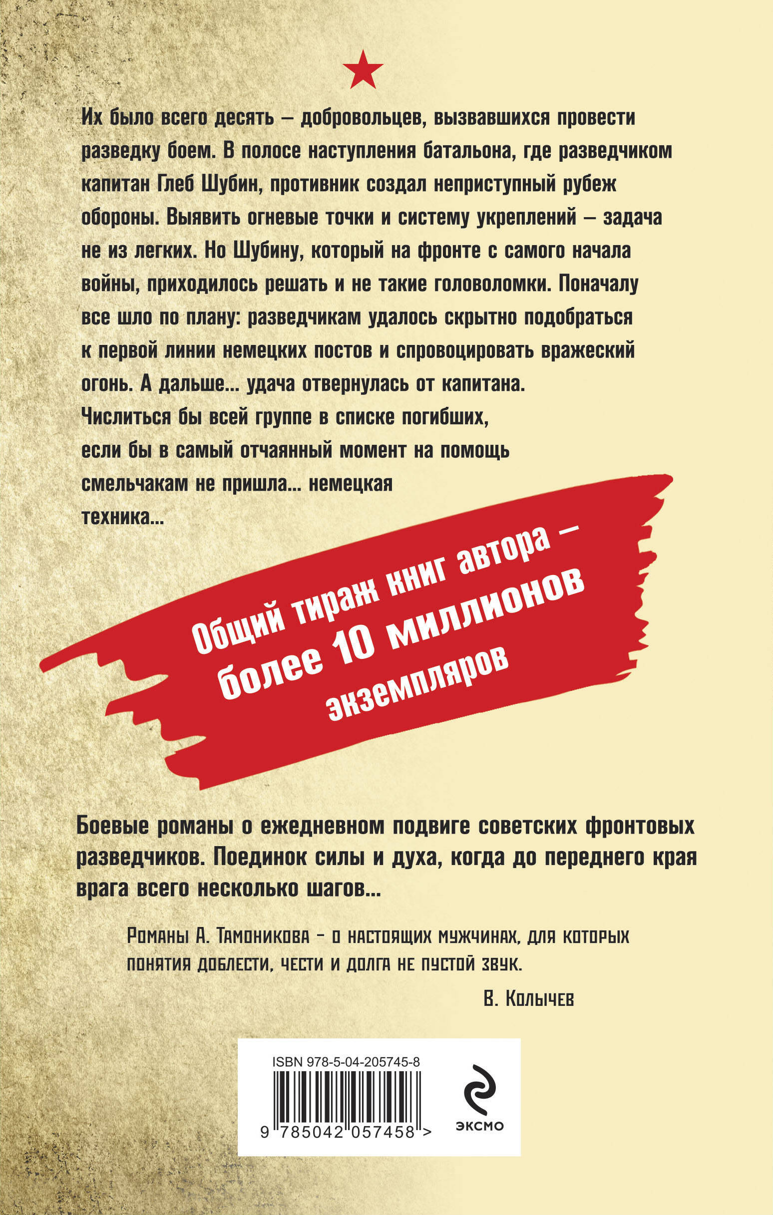 Боевые романы о ежедневном подвиге советских фронтовых разведчиков. Поединок силы и духа, когда до переднего края врага всего несколько шагов. Подробности жестоких боев, о которых не рассказывают даже ветераны-участники тех событий. Их было всего десять - добровольцев, вызвавшихся провести разведку боем. В полосе наступления батальона, где разведчиком капитан Глеб Шубин, противник создал неприступный рубеж обороны. Выявить огневые точки и систему укреплений - задача не из легких. Но Шубину, который на фронте с самого начала войны, приходилось решать и не такие головоломки. Поначалу все шло по плану: разведчикам удалось скрытно подобраться к первой линии немецких постов и спровоцировать вражеский огонь. А дальше... удача отвернулась от капитана. Числиться бы всей группе в списке погибших, если бы в самый отчаянный момент на помощь смельчакам не пришла… немецкая техника… Общий тираж книг автора - более 10 миллионов экземпляров.| Издательство | ООО "Издательство "Эксмо" |