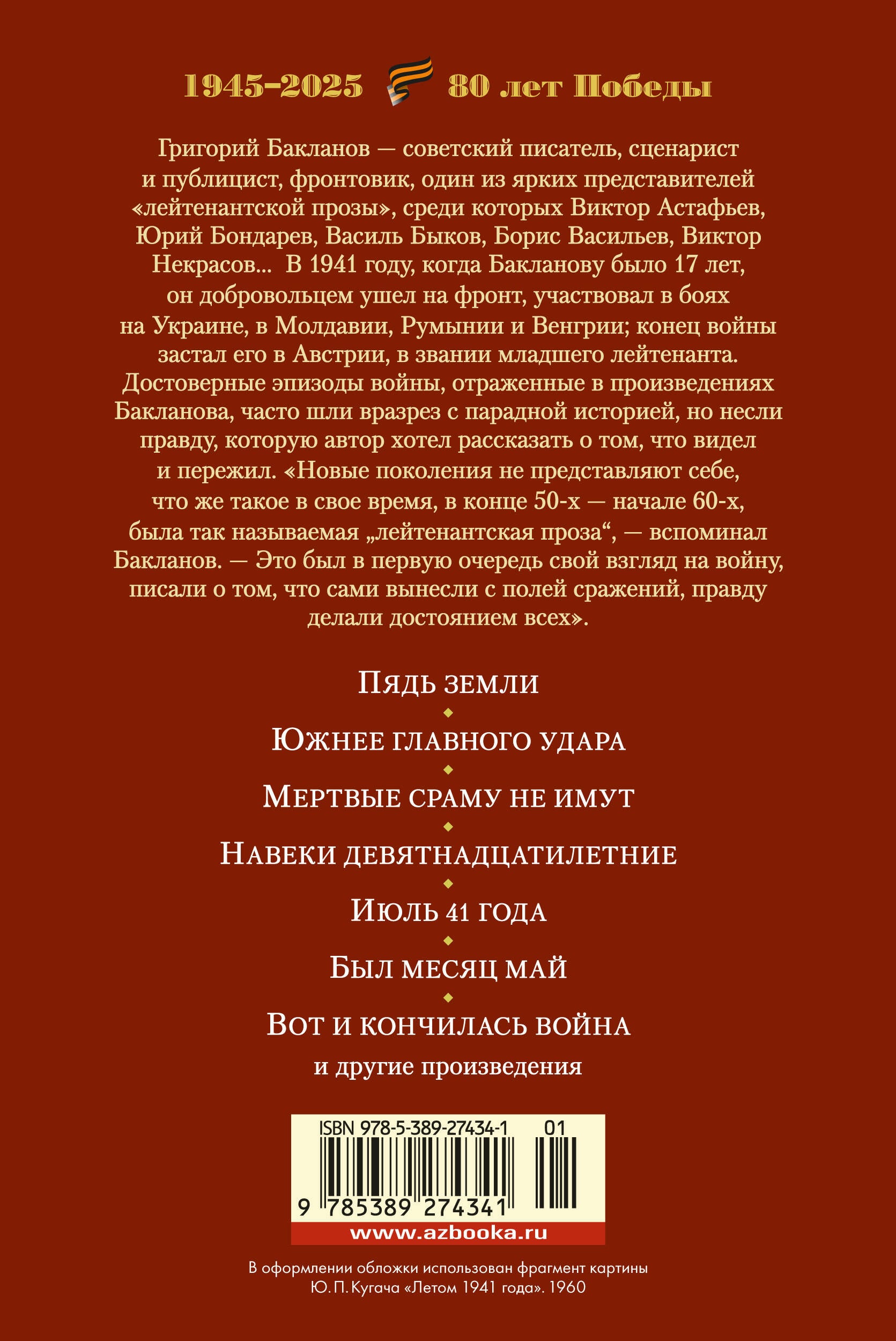 Григорий Бакланов - советский писатель, сценарист и публицист, фронтовик, один из ярких представителей "лейтенантской прозы", среди которых Виктор Астафьев, Юрий Бондарев, Василь Быков, Борис Васильев, Виктор Некрасов… В 1941 году, когда Бакланову было 17 лет, он добровольцем ушел на фронт, участвовал в боях на Украине, в Молдавии, Румынии и Венгрии; конец войны застал его в Австрии, в звании младшего лейтенанта. Достоверные эпизоды войны, отраженные в произведениях Бакланова, часто шли вразрез с парадной историей, но несли правду, которую автор хотел рассказать о том, что видел и пережил. "Новые поколения не представляют себе, что же такое в свое время, в конце 50-х - начале 60-х, была так называемая "лейтенантская проза", - вспоминал Бакланов. - Это был, в первую очередь, свой взгляд на войну, писали о том, что сами вынесли с полей сражений, правду делали достоянием всех". В настоящее издание вошли самые известные произведения Григория Бакланова, написанные в разные годы, включая ранние военные повести "Южнее главного удара" и "Пядь земли", роман "Июль 41 года", рассказы "Был месяц май", "Вот и кончилась война" и "Надя".| Издательство | Азбука-Аттикус Издат.группа ООО |