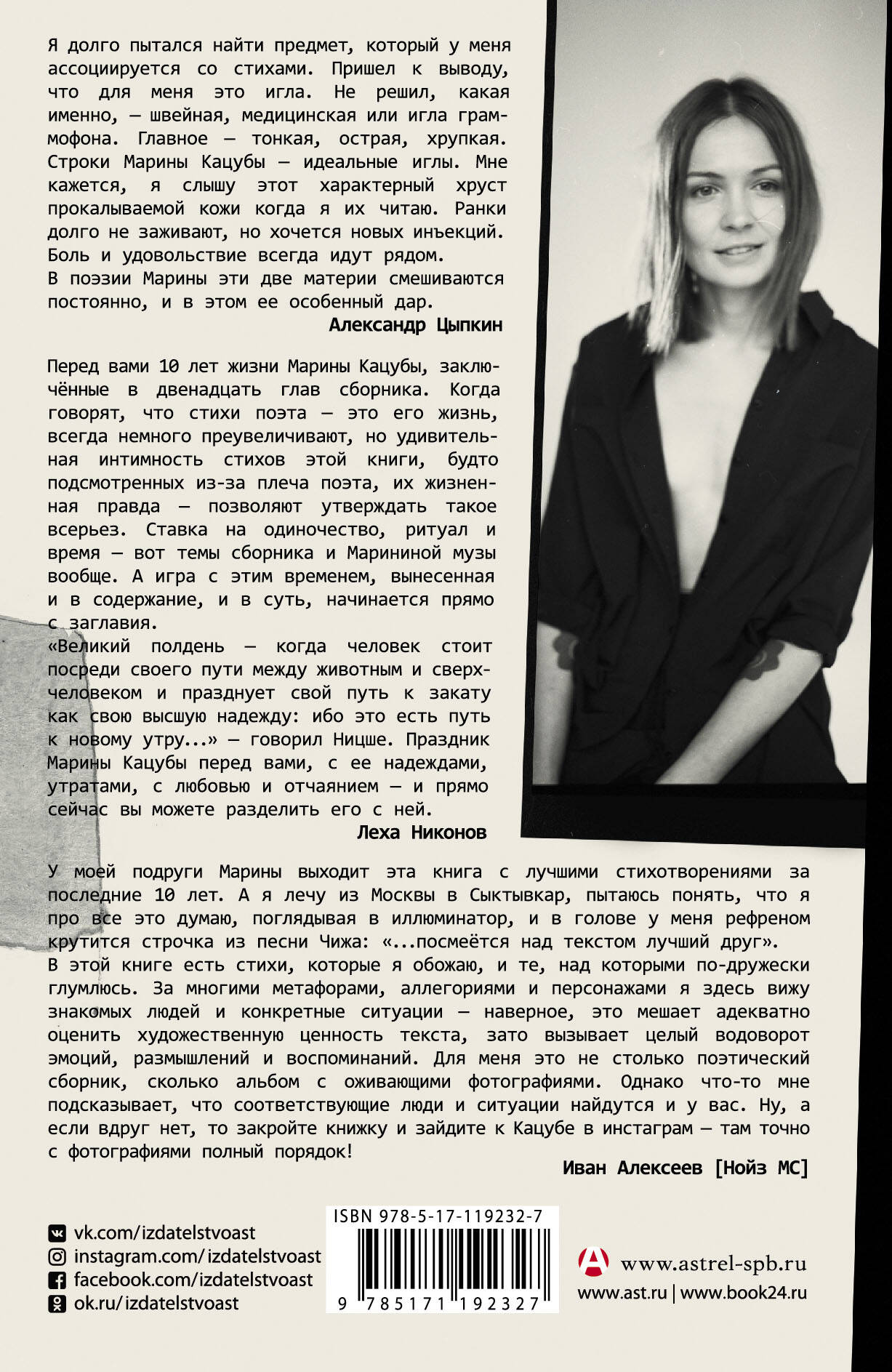 Марина Кацуба за 28 лет творчества и 12 лет публичных выступлений смогла сложить пестрый поэтический пазл в сердцах читателей, зрителей и слушателей далеко за пределами родного Петербурга. Выпустив уже три музыкальных альбома, за собрание сочинений в печатном виде под названием "Июнь" она взялась, только разглядев цикличность среди тысяч своих почти всегда случайных, внезапных стихотворений. Получился календарь, стартующий в начале лета, вместе с первыми цветами и еще хрупким предвкушением пышной жары. Именно в этом месяце поэт вот уже 33 года перерождается и оживает. Каждая из 12 глав - тоже цикл, круг, ибо стихи собраны отнюдь не в хронологическом порядке. В основе их последовательности - принцип соответствия эмоционального посыла и состояния, проживания момента внутри времен года.| Издательство | ИЗДАТЕЛЬСТВО "АСТ" |