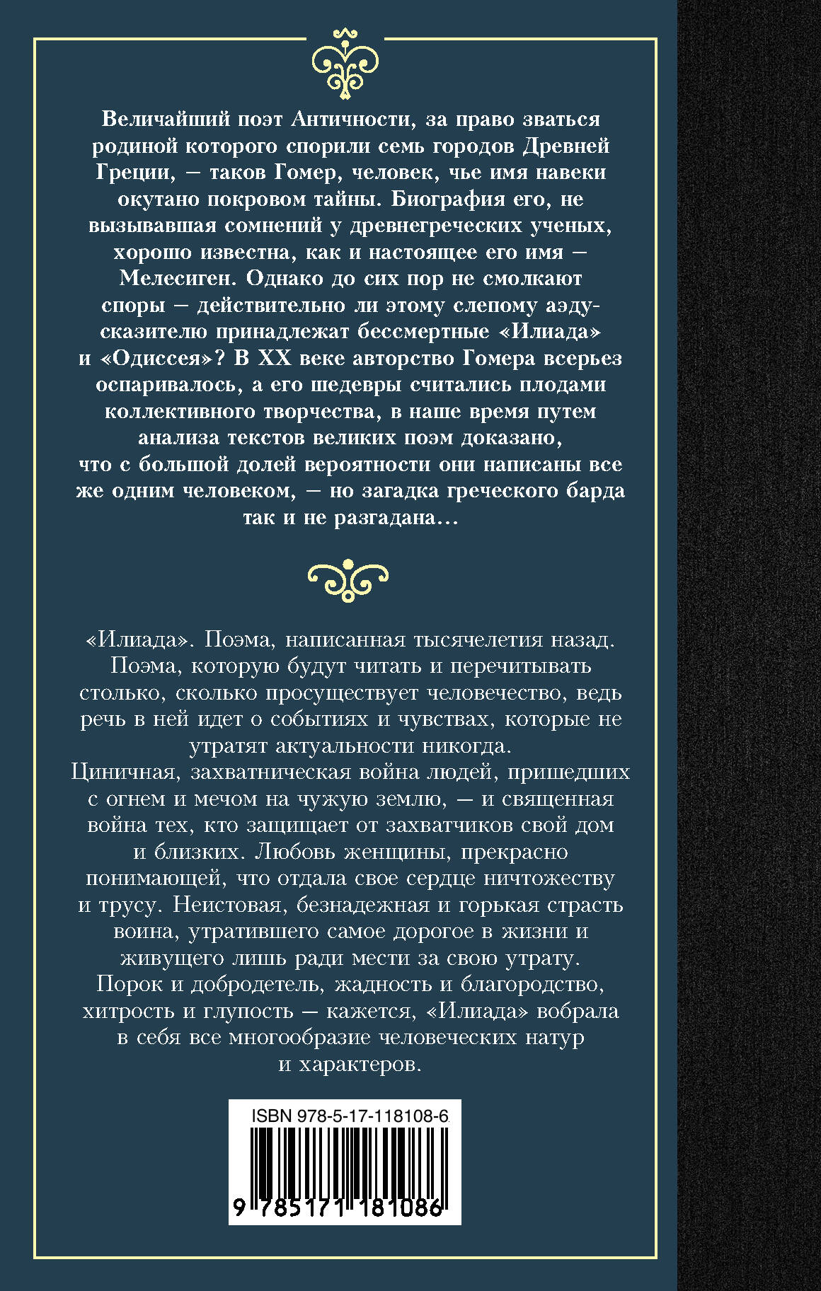 "Илиада". Поэма, написанная тысячелетия назад. Поэма, которую будут читать и перечитывать столько, сколько просуществует человечество, ведь речь в ней идет о событиях и чувствах, которые не утратят актуальности никогда. Циничная, захватническая война людей, пришедших с огнем и мечом на чужую землю, - и священная война тех, кто защищает от захватчиков свой дом и близких. Любовь женщины, прекрасно понимающей, что отдала свое сердце ничтожеству и трусу. Неистовая, безнадежная и горькая страсть воина, утратившего самое дорогое в жизни и живущего лишь ради мести за свою утрату. Порок и добродетель, жадность и благородство, хитрость и глупость - кажется, "Илиада" вобрала в себя все многообразие человеческих натур и характеров.| Издательство | Издательство "АСТ" |