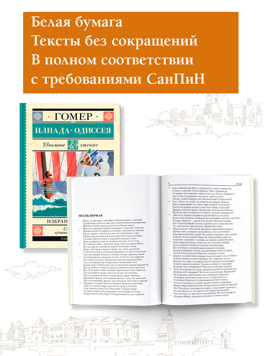 Гоме́р (VIII-VII вв. до н.) - легендарный древнегреческий поэт-сказитель, создатель эпических поэм "Илиада" (древнейшего памятника европейской литературы) и "Одиссея". В книгу вошли отдельные главы поэм "Илиада" и "Одиссея", которые проходят на уроках литературы в школе.| Издательство | ИЗДАТЕЛЬСТВО "АСТ" |